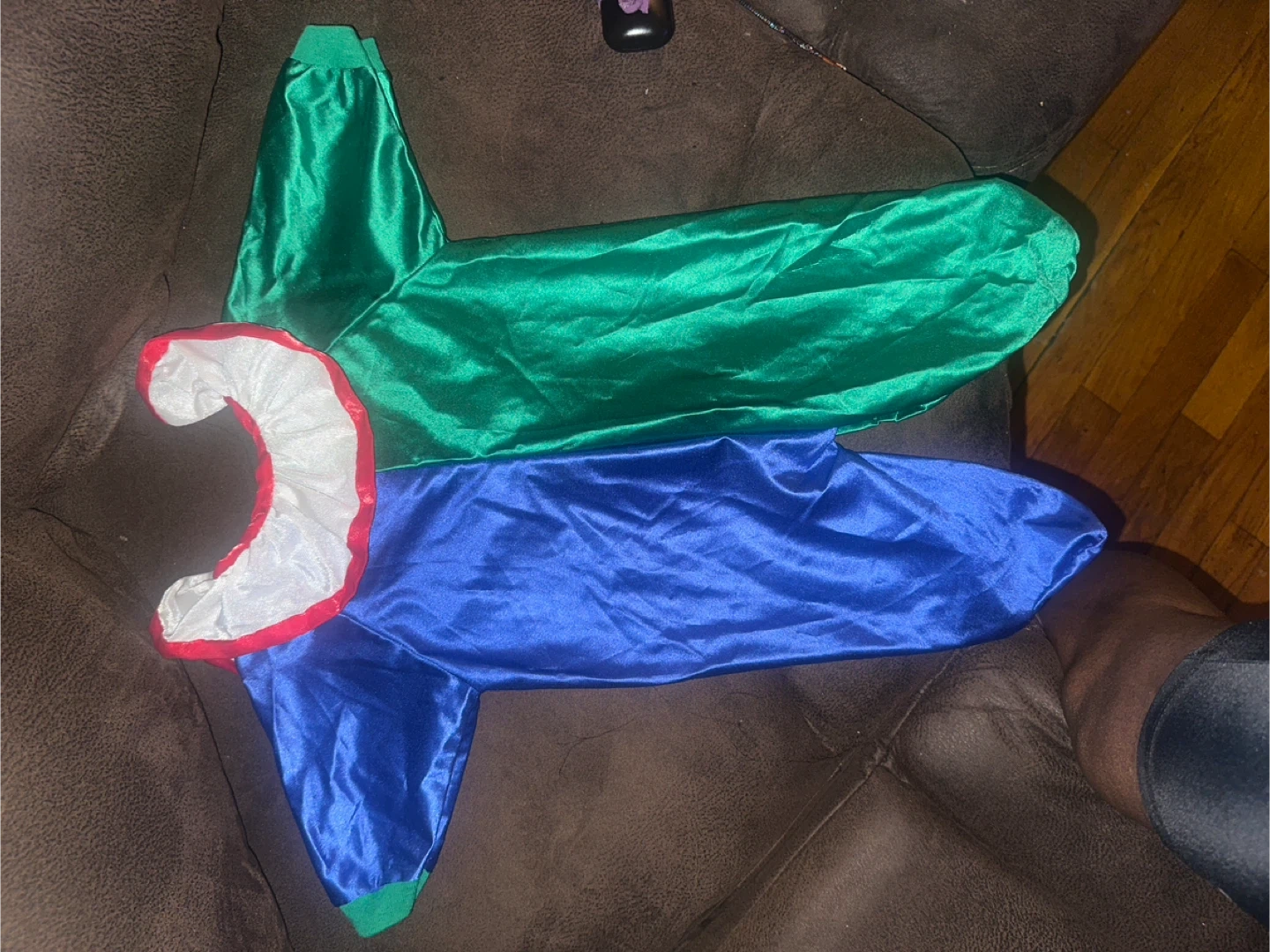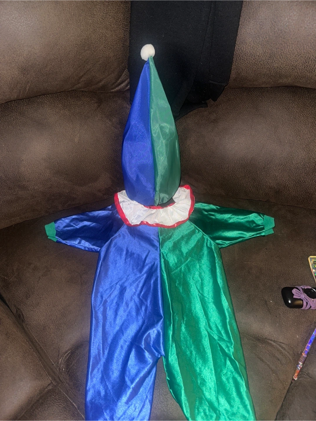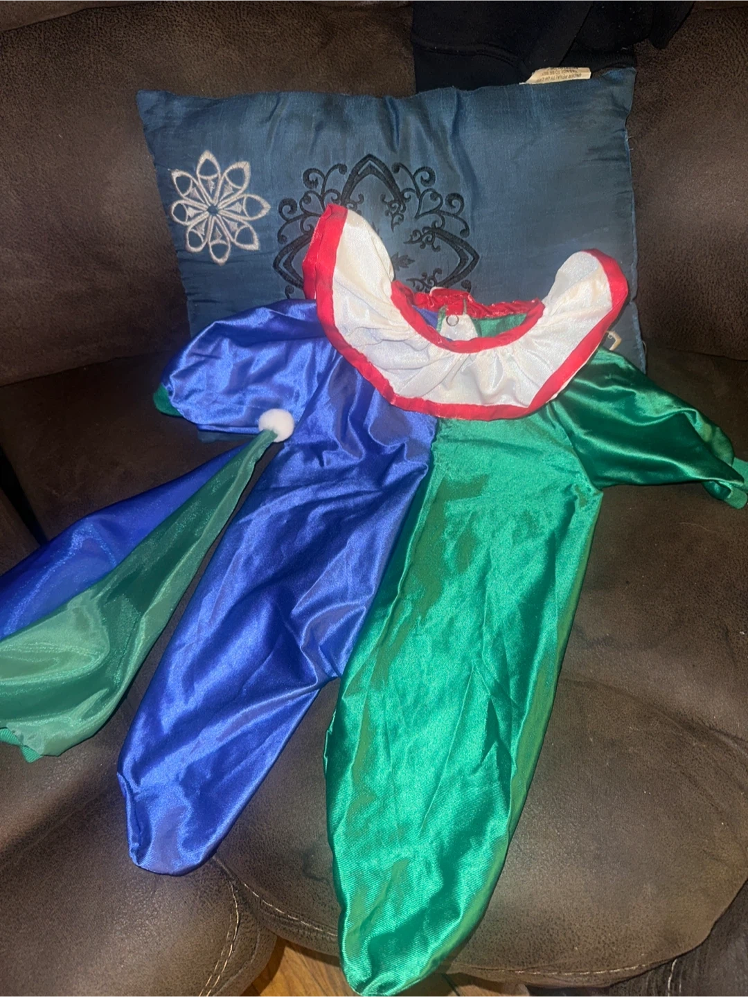 A cute Jester costume in blue and green! Perfect for dress-up or a fun Halloween events. Easily fits over clothing ages 0 to 6 months Used 1 time