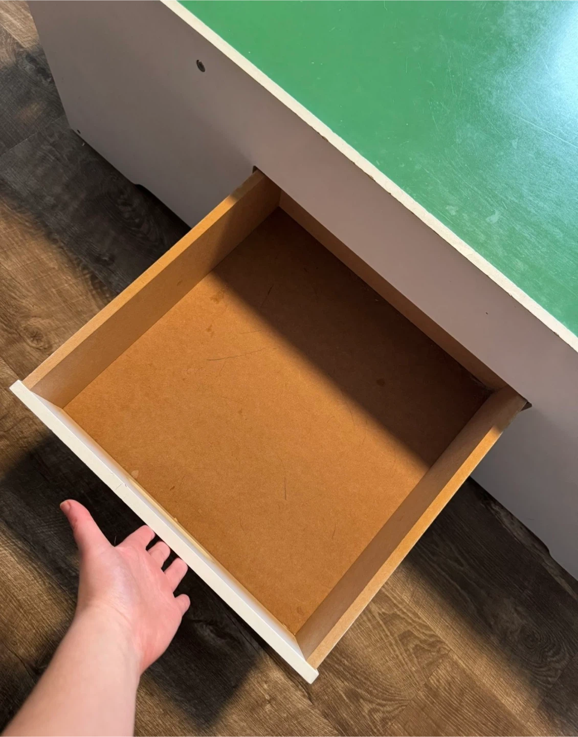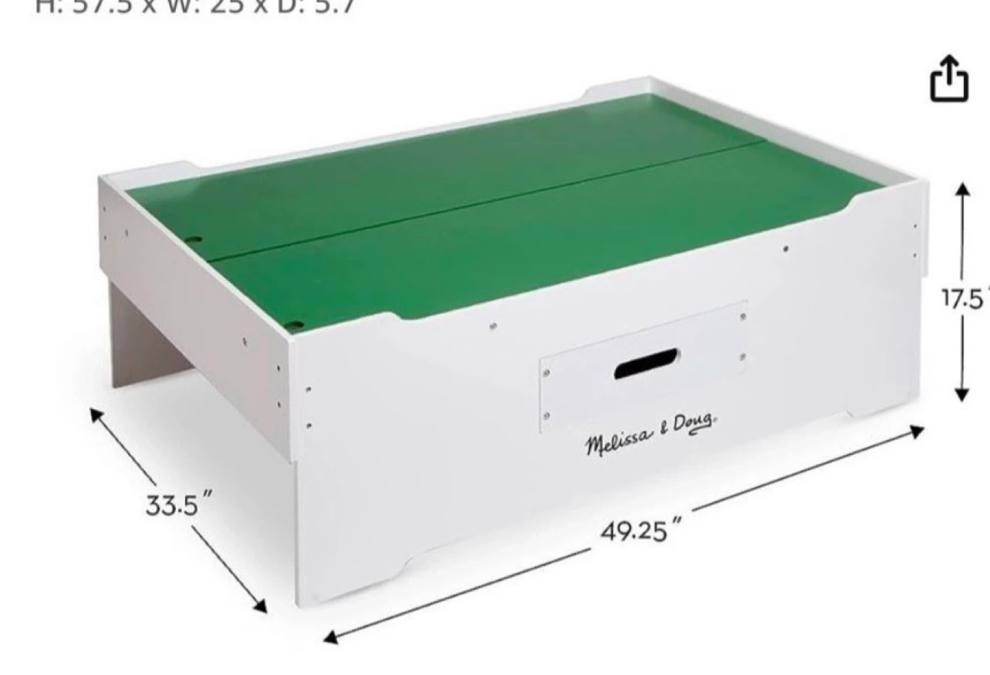 This is a wooden activity table by Melissa & Doug. It features a green play surface with a built-in drawer for storage. Dimensions are 49.25" L x 33.5" W x 17.5" H.
