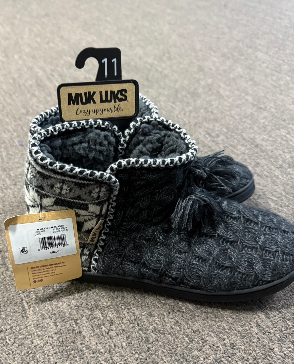 Cozy up your life with these Muk Luks knit back boot slippers! They're a women's size 11 and feature a warm and cozy memory foam insole. Made from recycled plastic, these slippers are as comfy as they are eco-friendly. Originally priced at $18.00, they're ready for a new home!