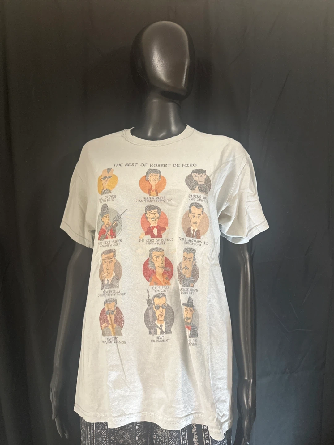 Light blue t-shirt featuring "The Best of Robert De Niro" graphic with characters from his films. Shows Travis Bickle, Jake LaMotta, Rupert Pupkin, Vito Corleone, and others. Cotton material.