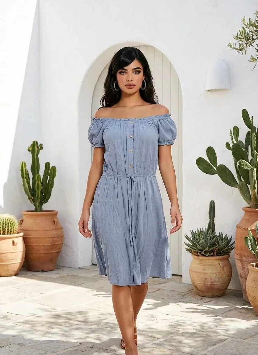 This blue off-the-shoulder dress features a button-front detail and a tie waist. It has short puff sleeves and a ruffled neckline. A versatile piece for casual outings!