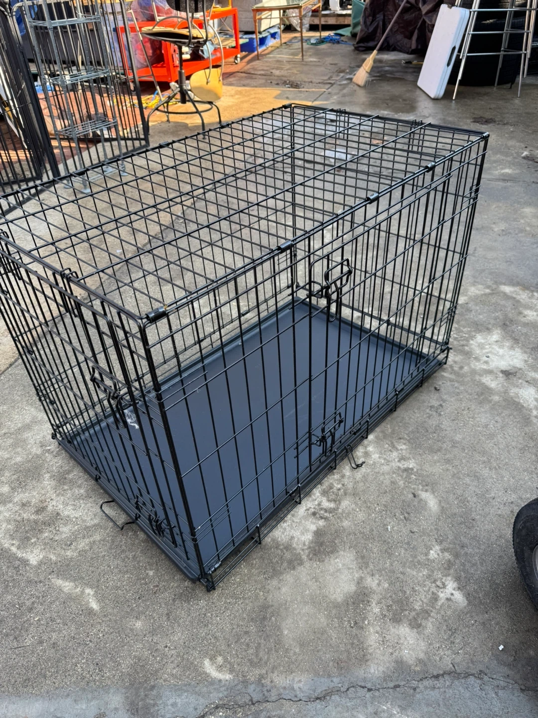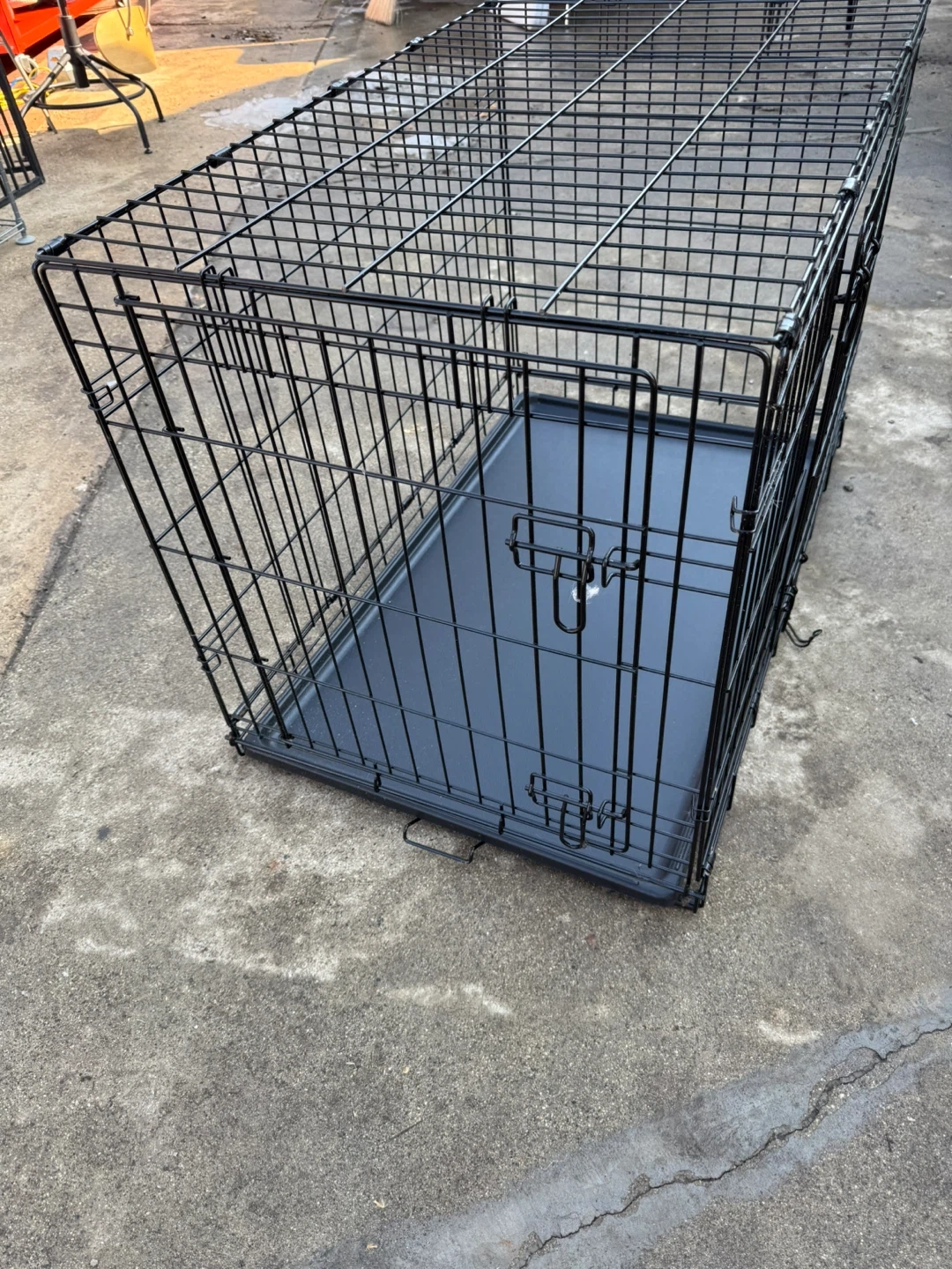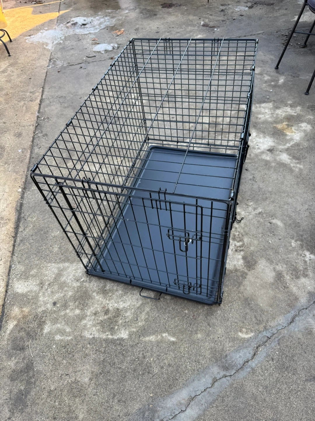 This is a black wire pet crate with a removable plastic tray. It measures approximately 36 inches long by 23 inches wide. The crate has two doors with secure latches. It's foldable for easy storage.