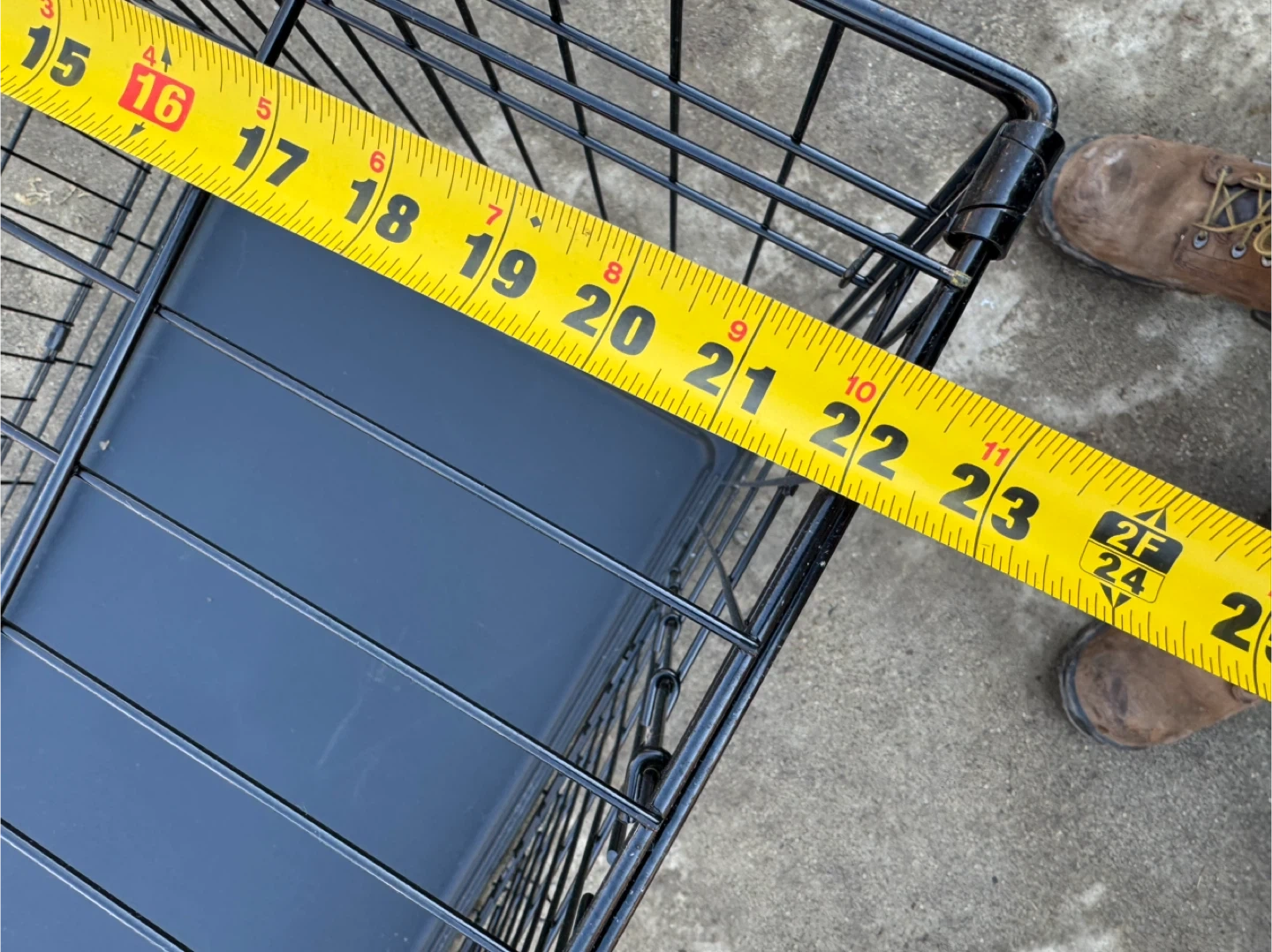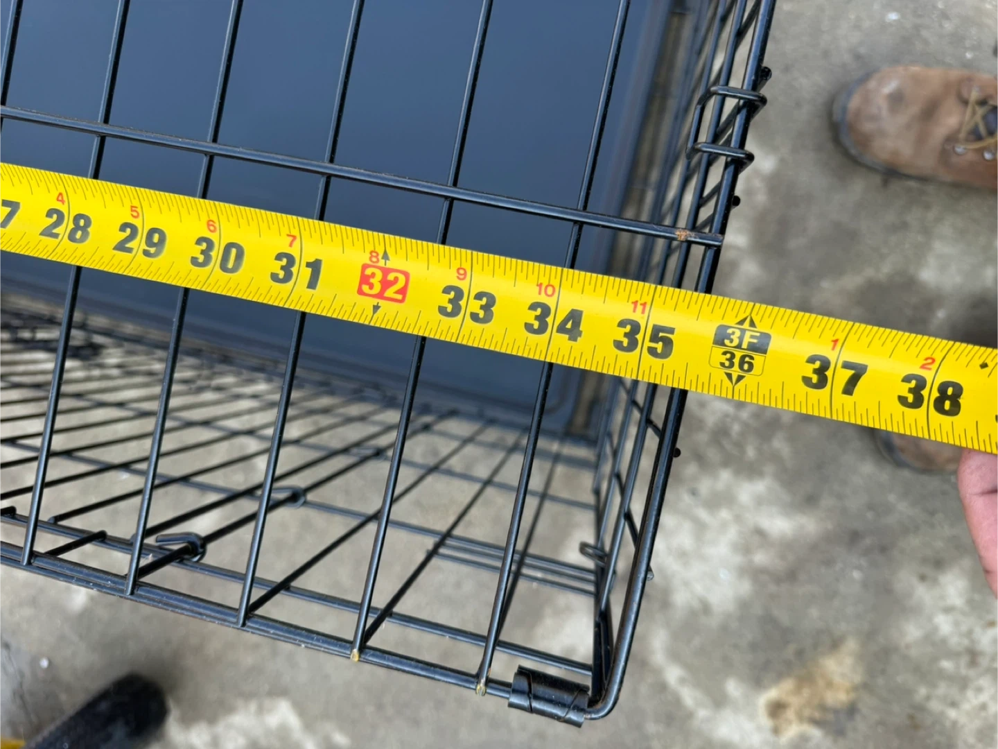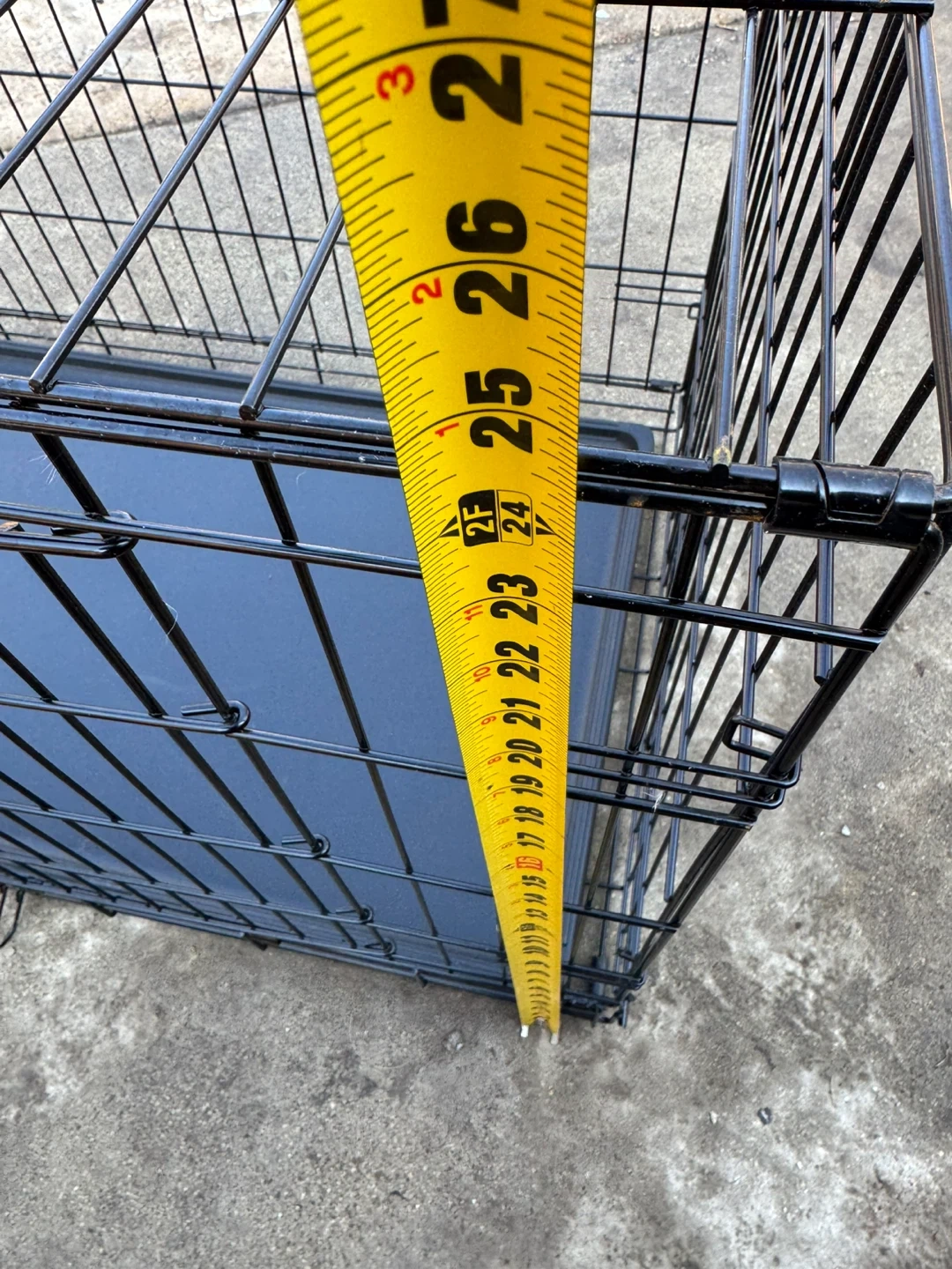 This is a black wire pet crate with a removable plastic tray. It measures approximately 36 inches long by 23 inches wide. The crate has two doors with secure latches. It's foldable for easy storage.