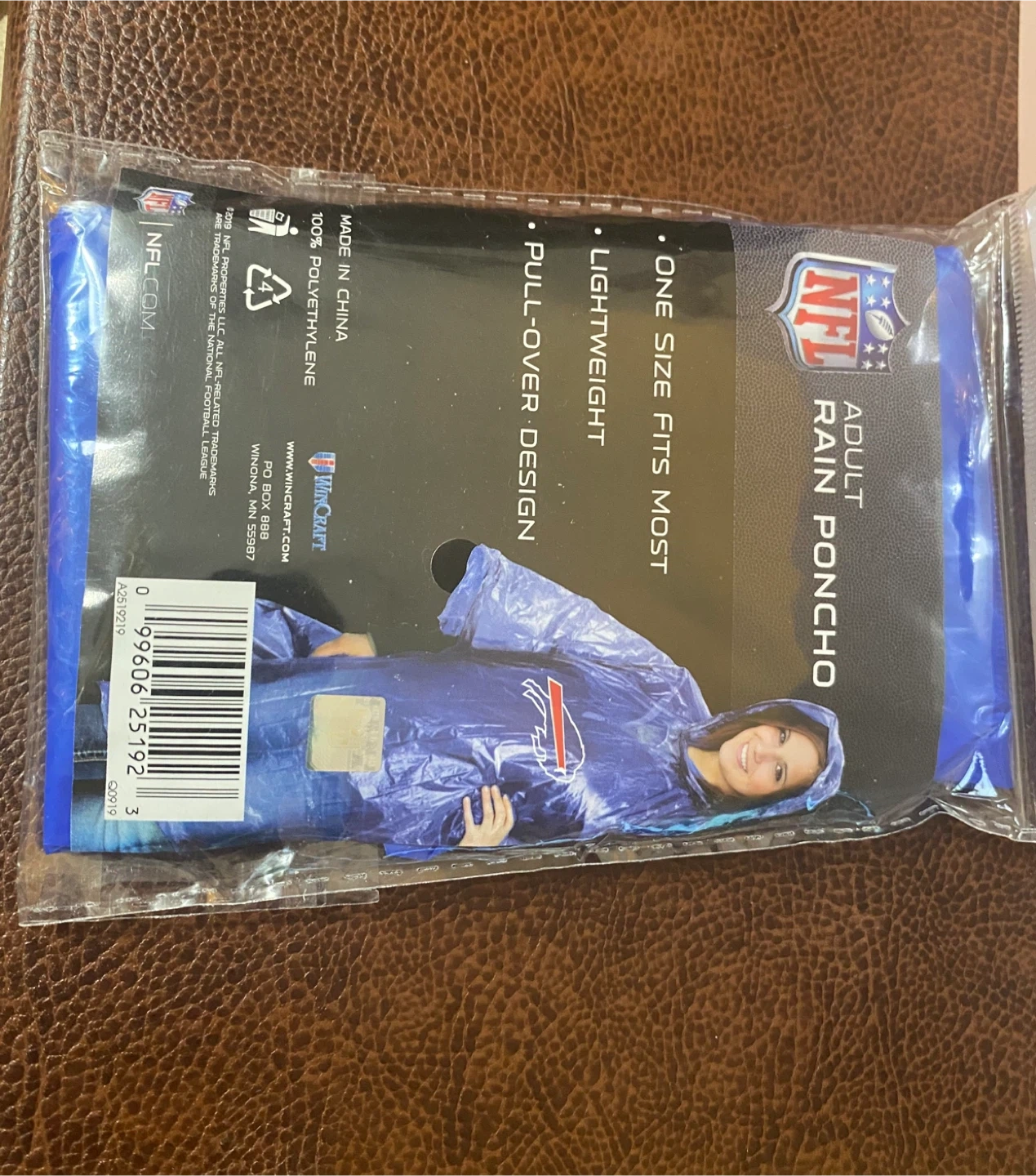 This is an adult rain poncho from the NFL. It's lightweight with a pull-over design. Made from 100% polyethylene. One size fits most.
