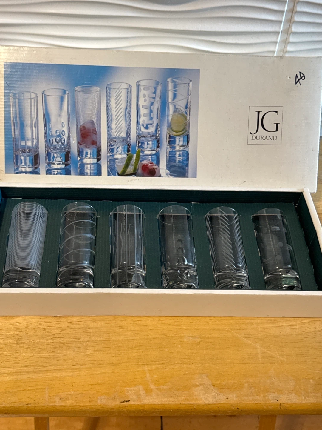 Selling a set of six JG Durand shot glasses! They come in their original box and each glass has a unique design. Perfect for adding a touch of elegance to your home bar or for entertaining guests