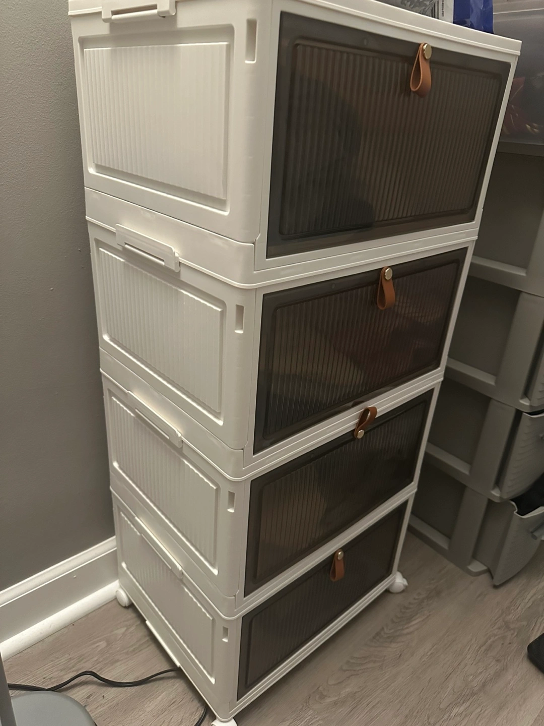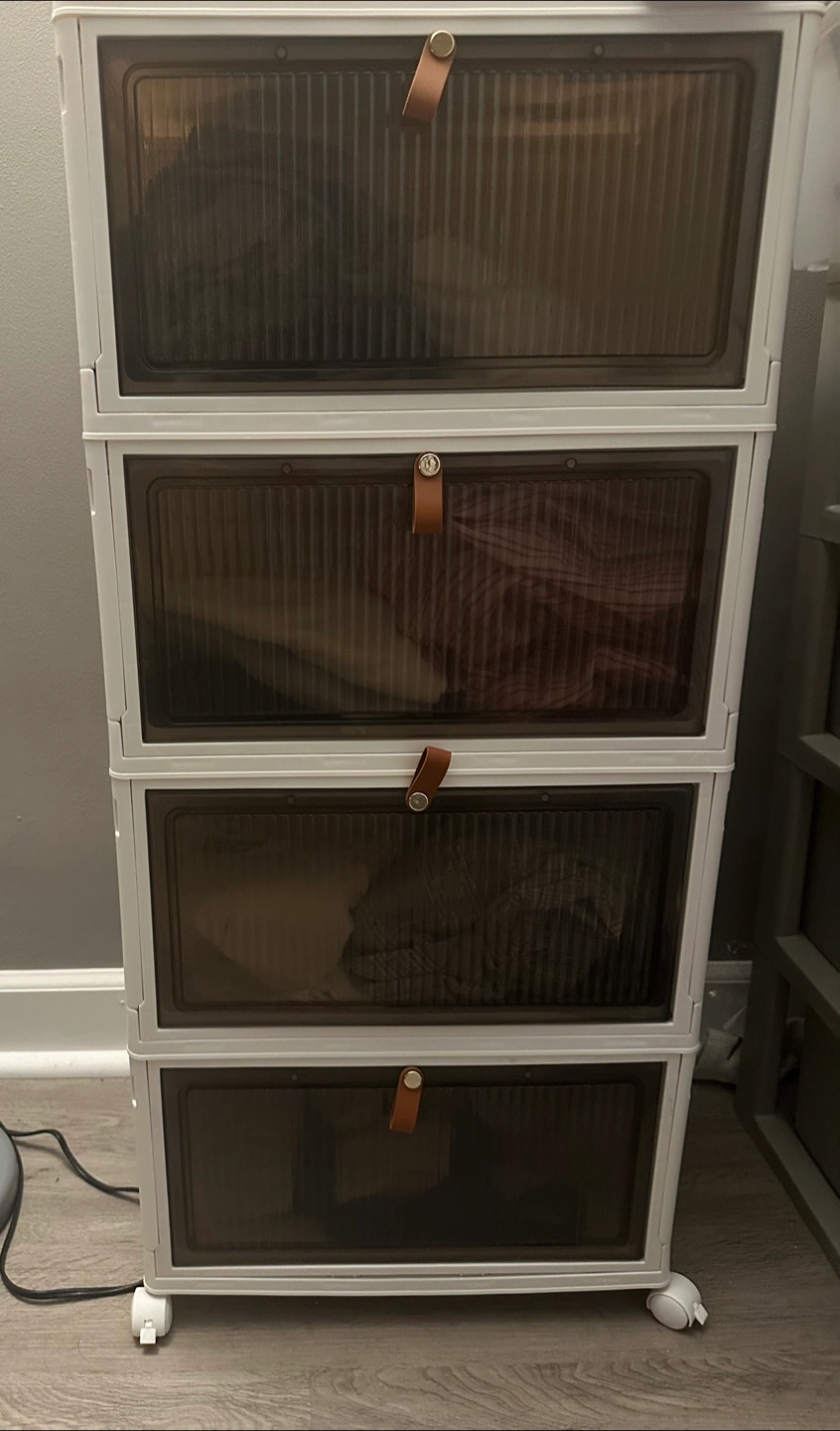 Four-drawer plastic stackable storage unit. Great for clothes, shoes, or other items. Features brown leatherette handles and clear drawers. On wheels for easy mobility.