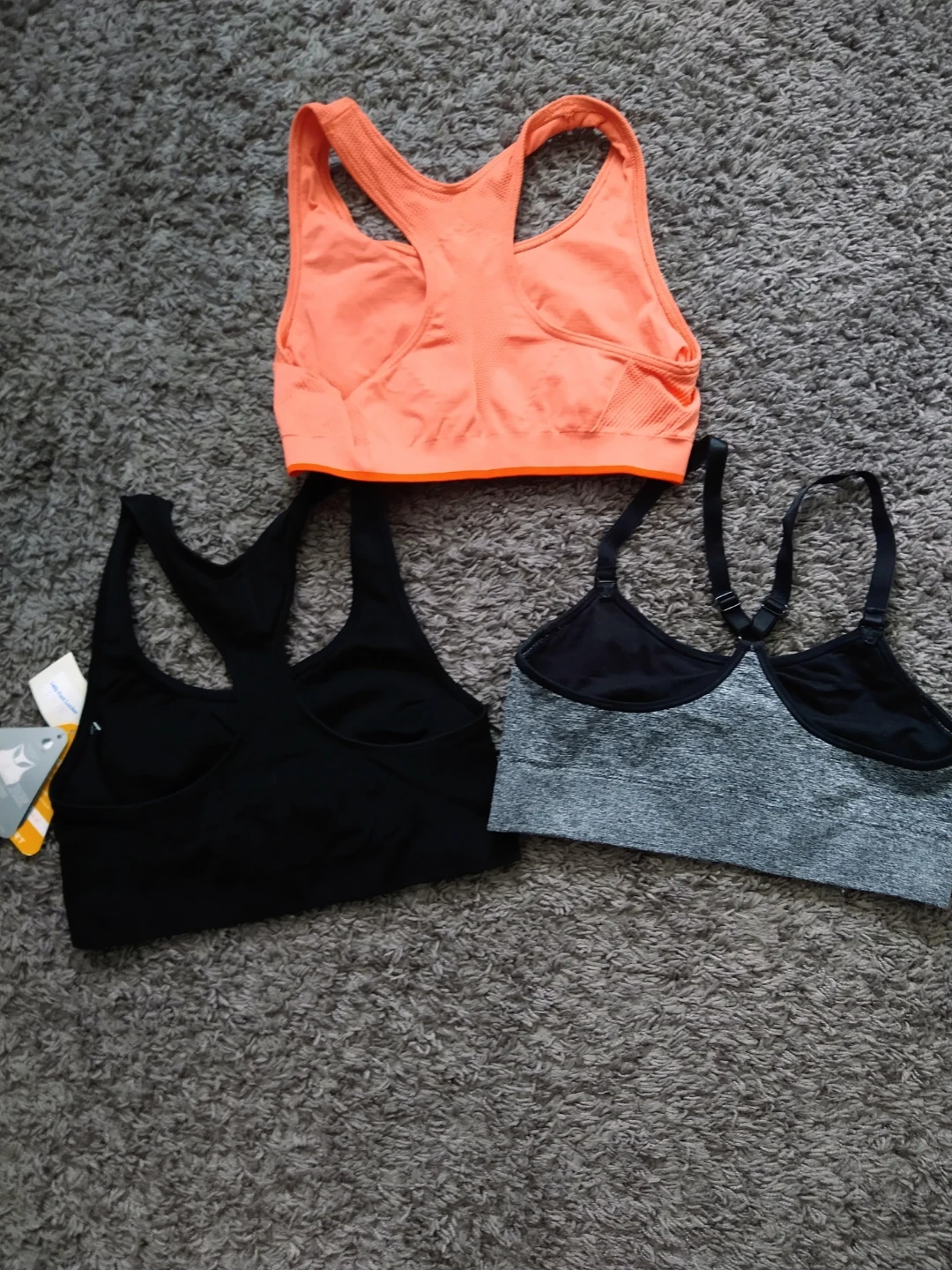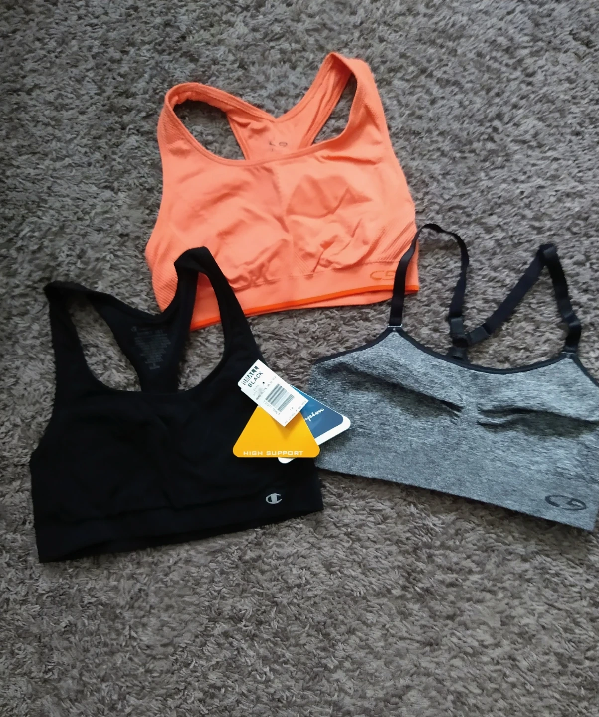 SET OF 3 CHAMPION WOMEN'S SUPPORT SPORTS BRA'S SIZE SMALL SPANDEX, POLYESTER, LIGHTWEIGHT FABRIC AND CHAMPION BLACK SPORTs BRA NWT OTHER 2 WORN ONCE. DID NOT FIT ME PROPERLY
