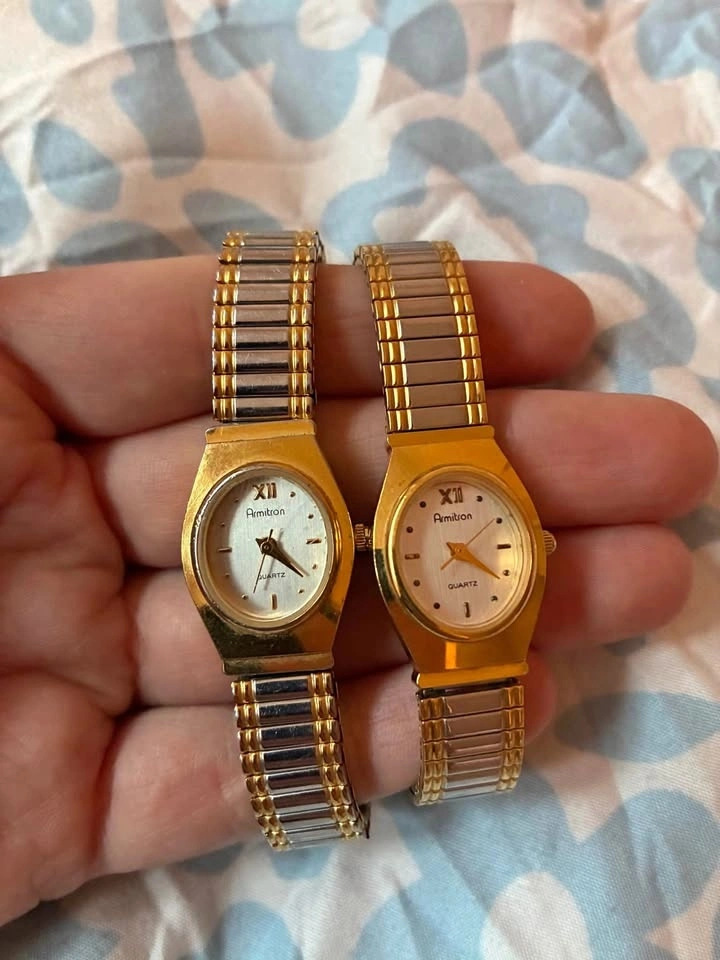 A pair of women's Armitron quartz watches. Both have gold-tone cases and bands with silver-tone accents. They feature white dials and are battery-powered. You may buy a single one for $20 or both for $30.