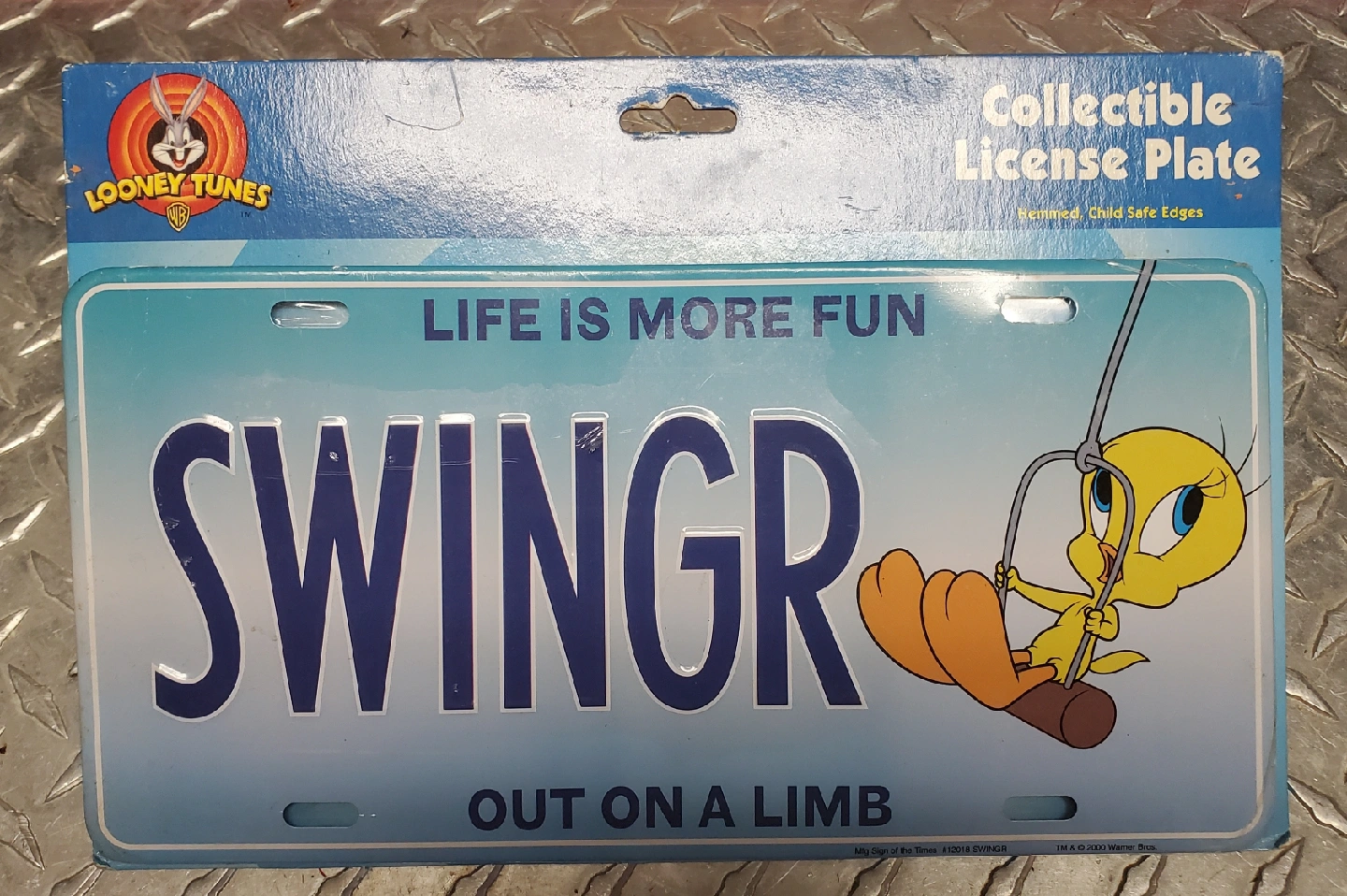 Selling a collectible license plate featuring Tweety Bird from Looney Tunes! It says "Life is more fun SWINGR out on a limb". It has hemmend child safe edges.