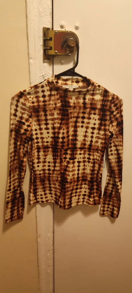 Here's a Mauve Moin long sleeve top with a unique brown pattern! It's in great condition and ready for a new home. Perfect for adding a touch of style to your wardrobe