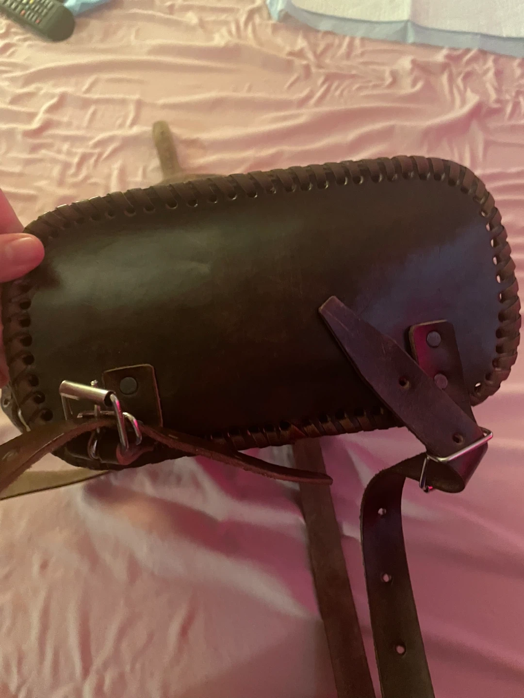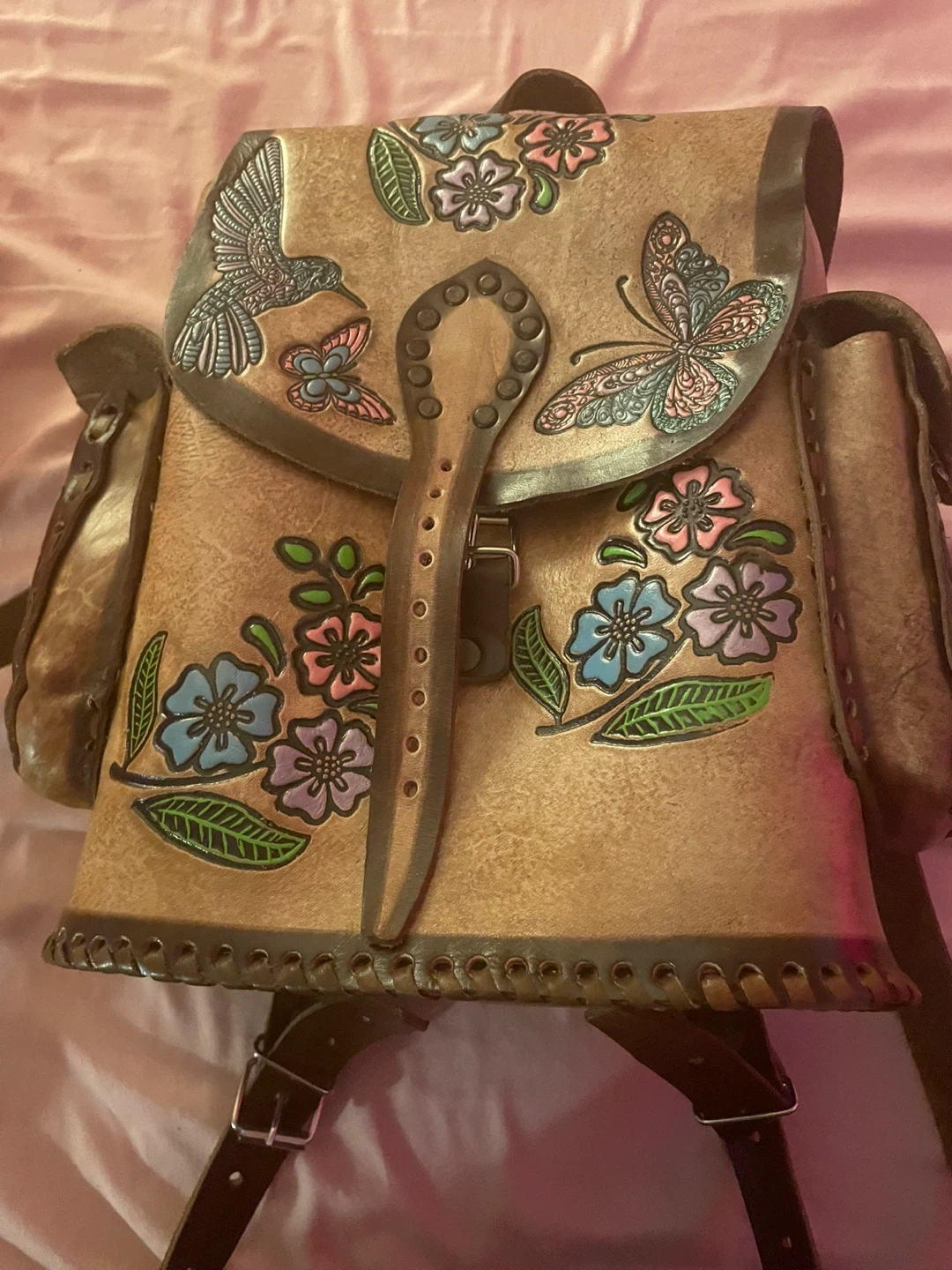 This leather backpack features a beautiful embossed design with colorful flowers, leaves, a butterfly, and a hummingbird. It has adjustable straps and multiple compartments for storage. The intricate stitching and tooling add to its unique look.