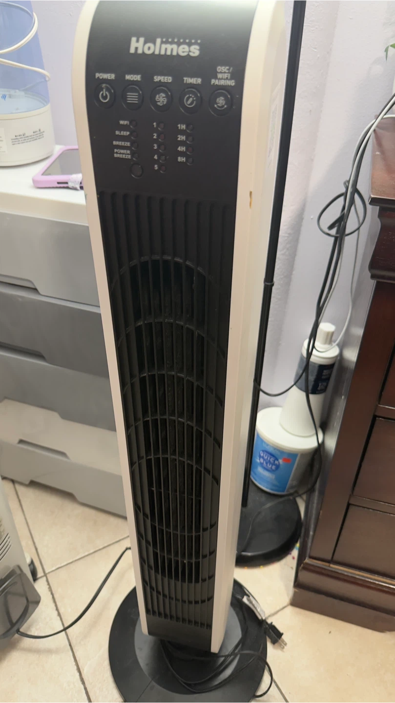 Selling a Holmes tower fan. It has multiple modes including WiFi, sleep, and breeze. There are five different speed settings, and a timer with 1, 2, 4, and 8 hour options