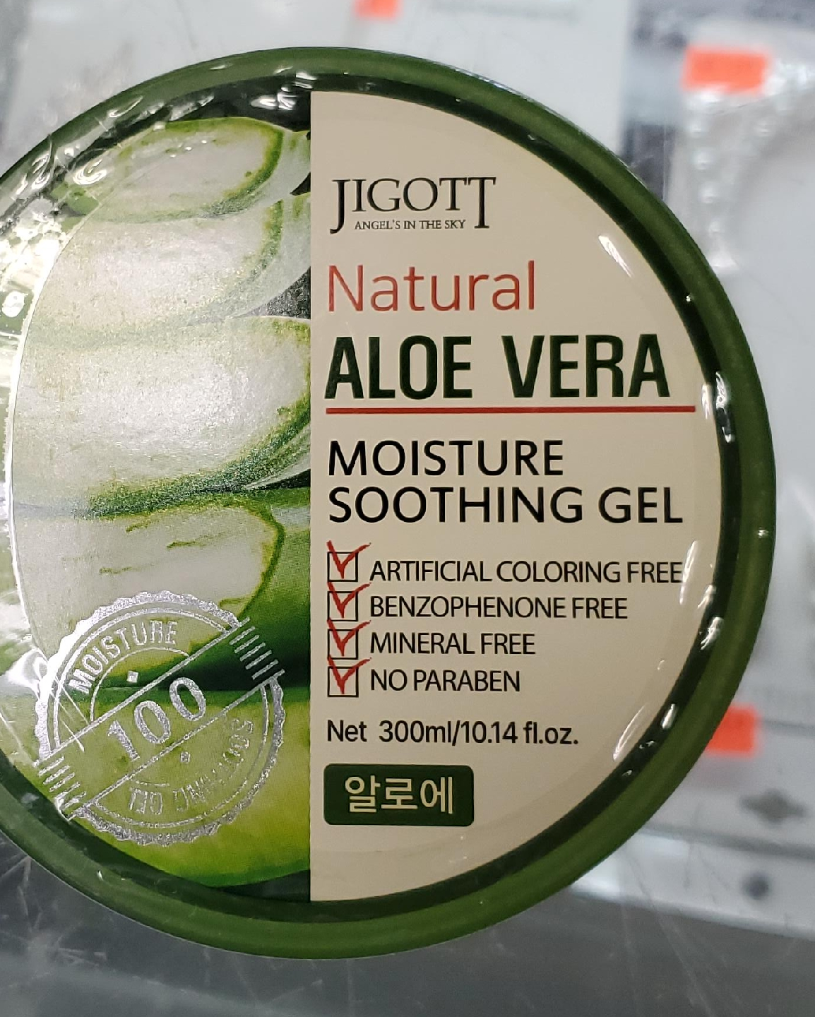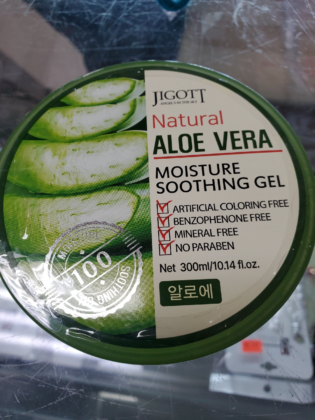 10This is a Jigott Natural Aloe Vera Moisture Soothing Gel. It's a moisture-rich gel that's free of artificial coloring, benzophenone, mineral oil, and parabens. Contains 300ml / 10.14 fl oz of product