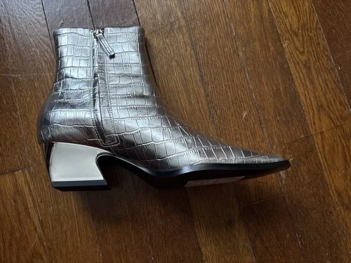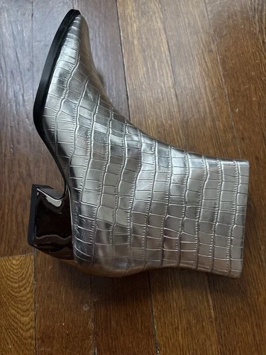 This is one Kat Maconie Amari Silver Croc Ankle Boot in size 37. It features a zip closure and a 2-inch heel with lucite trim. Made of leather with embroidered accents, these ankle boots have a designer block heel and a unique dancer pattern. The black color and bohemian theme make them a fashionable choice. I’m looking to find the matching one! Only I have is one!
