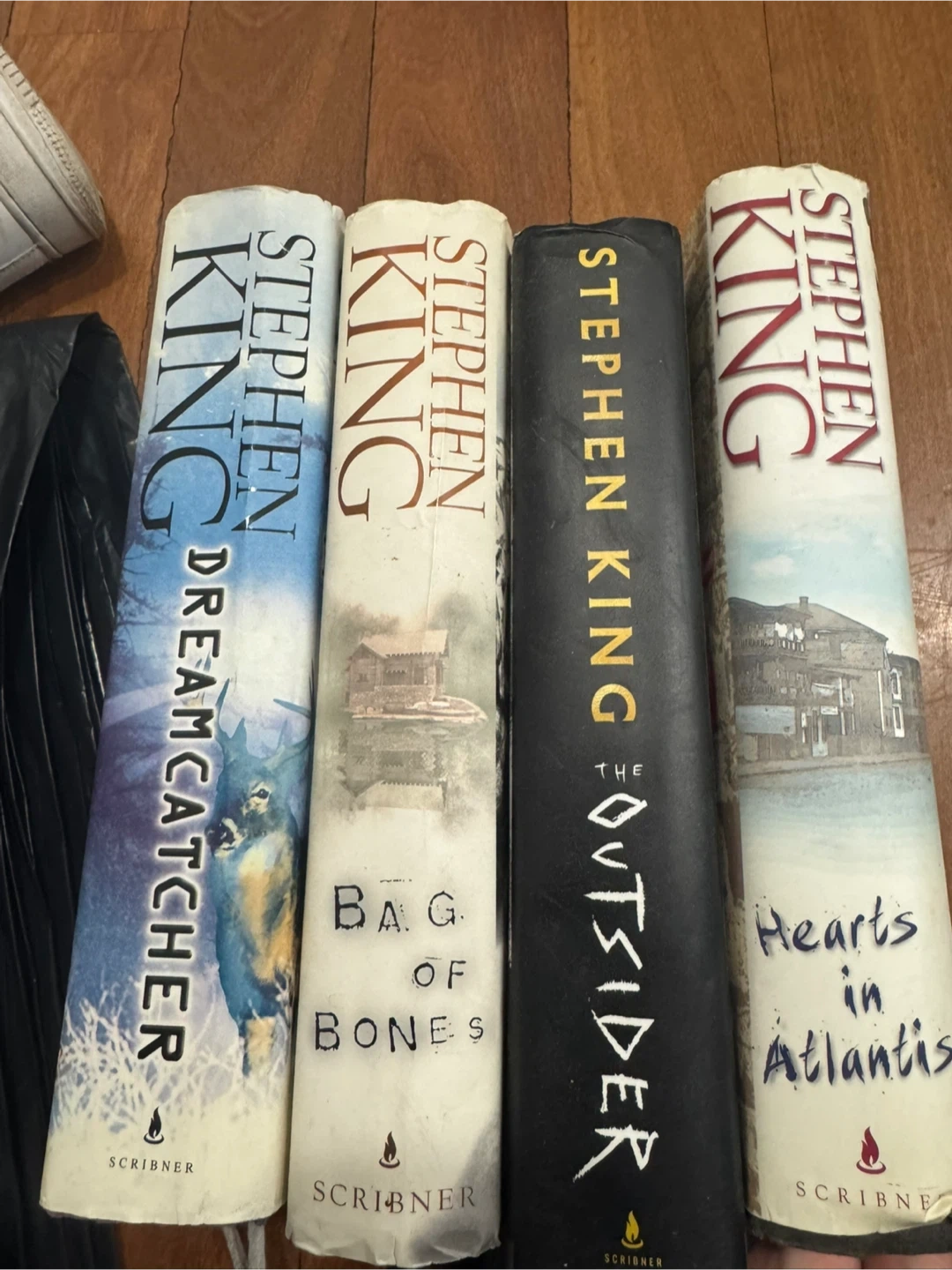 Four first print hardcover Stephen King novels included: Dreamcatcher, Bag of Bones, The Outsider, and Hearts in Atlantis.