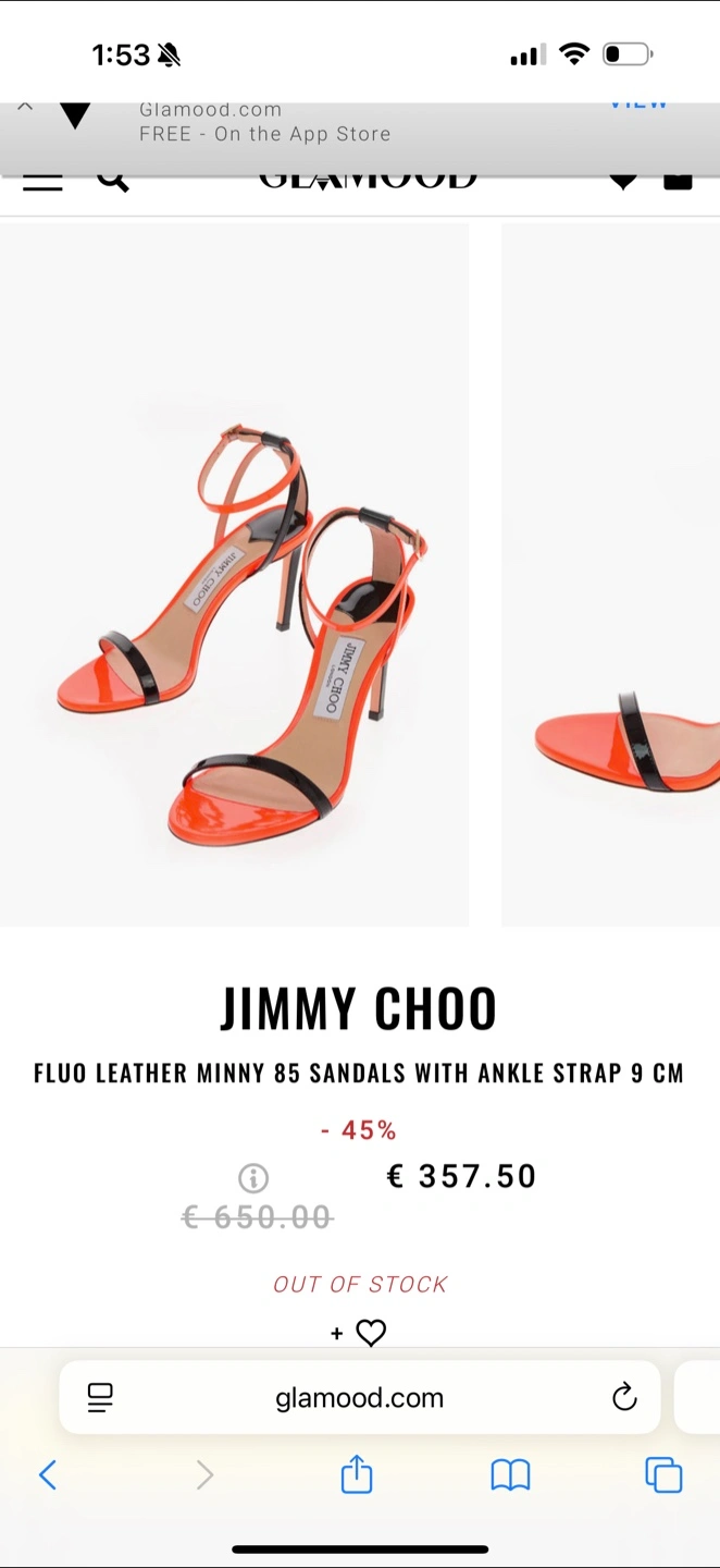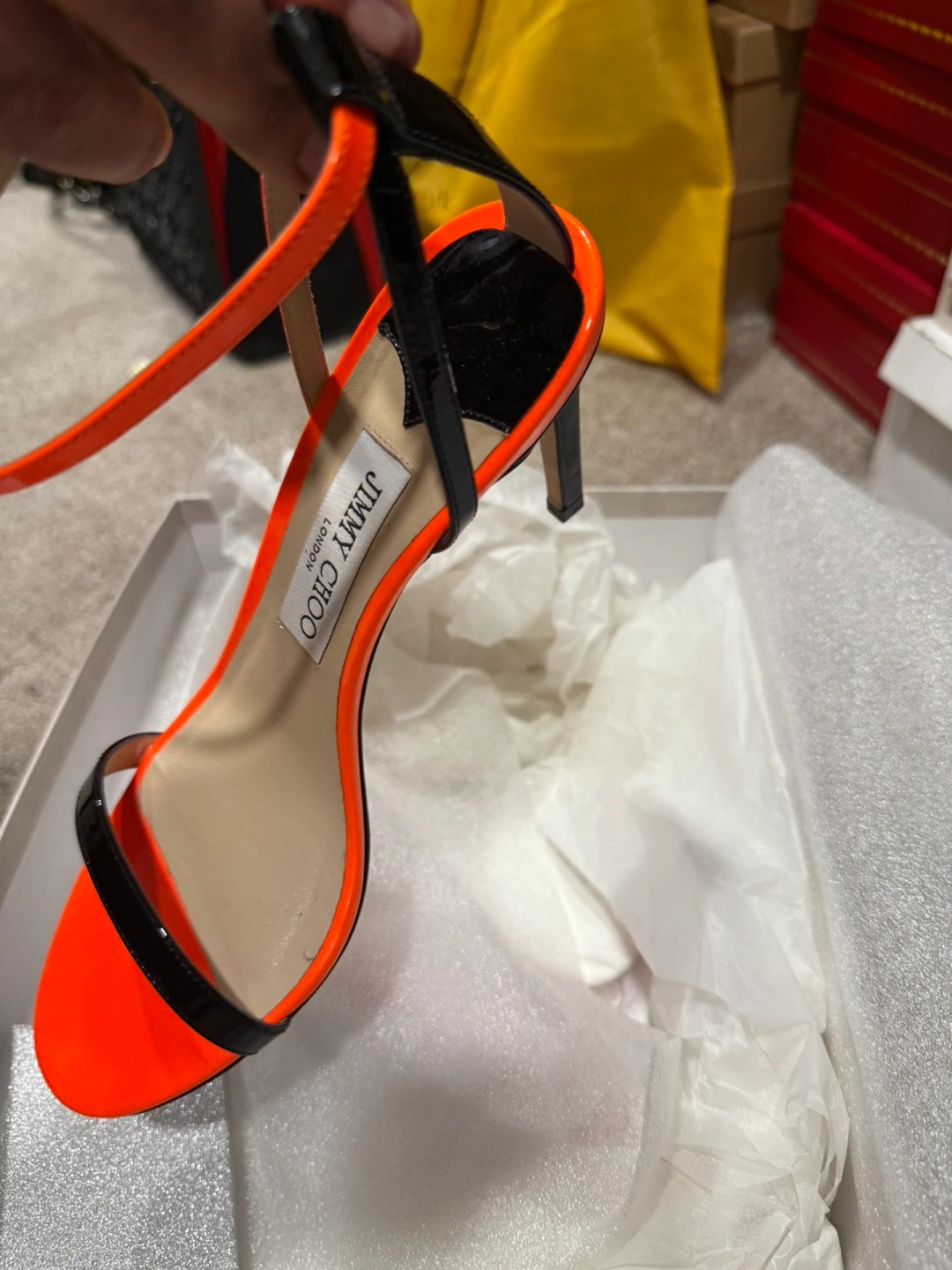 These Jimmy Choo Fluo Leather Minny 85 sandals are in great condition! They have an ankle strap and a 9 cm heel. The original price was €650. They are orange and black and come with the box
