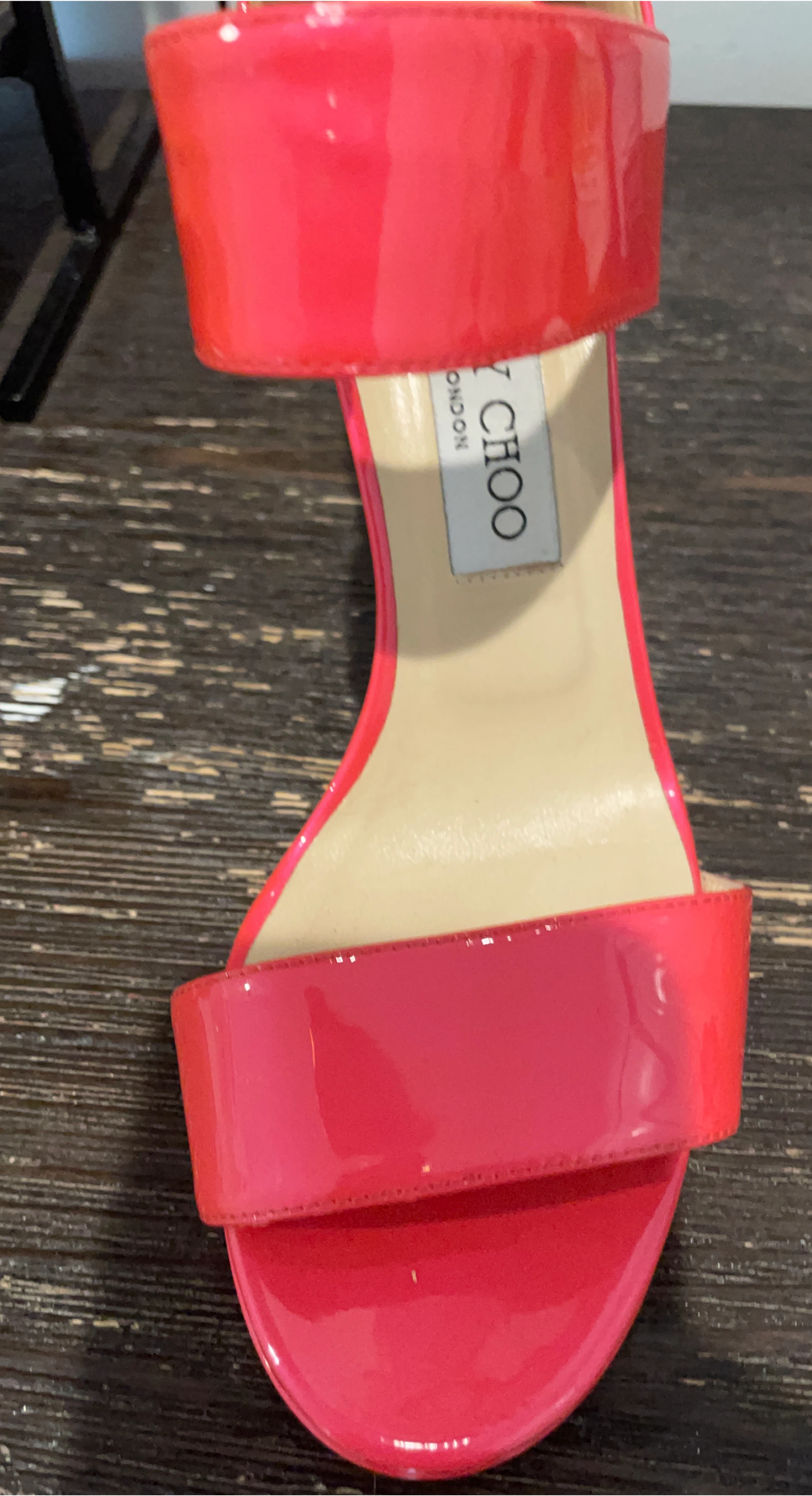 These are a pair of Jimmy Choo heels in a vibrant hot pink color. They feature a patent leather finish and a simple, elegant design. Perfect for adding a pop of color to any outfit!