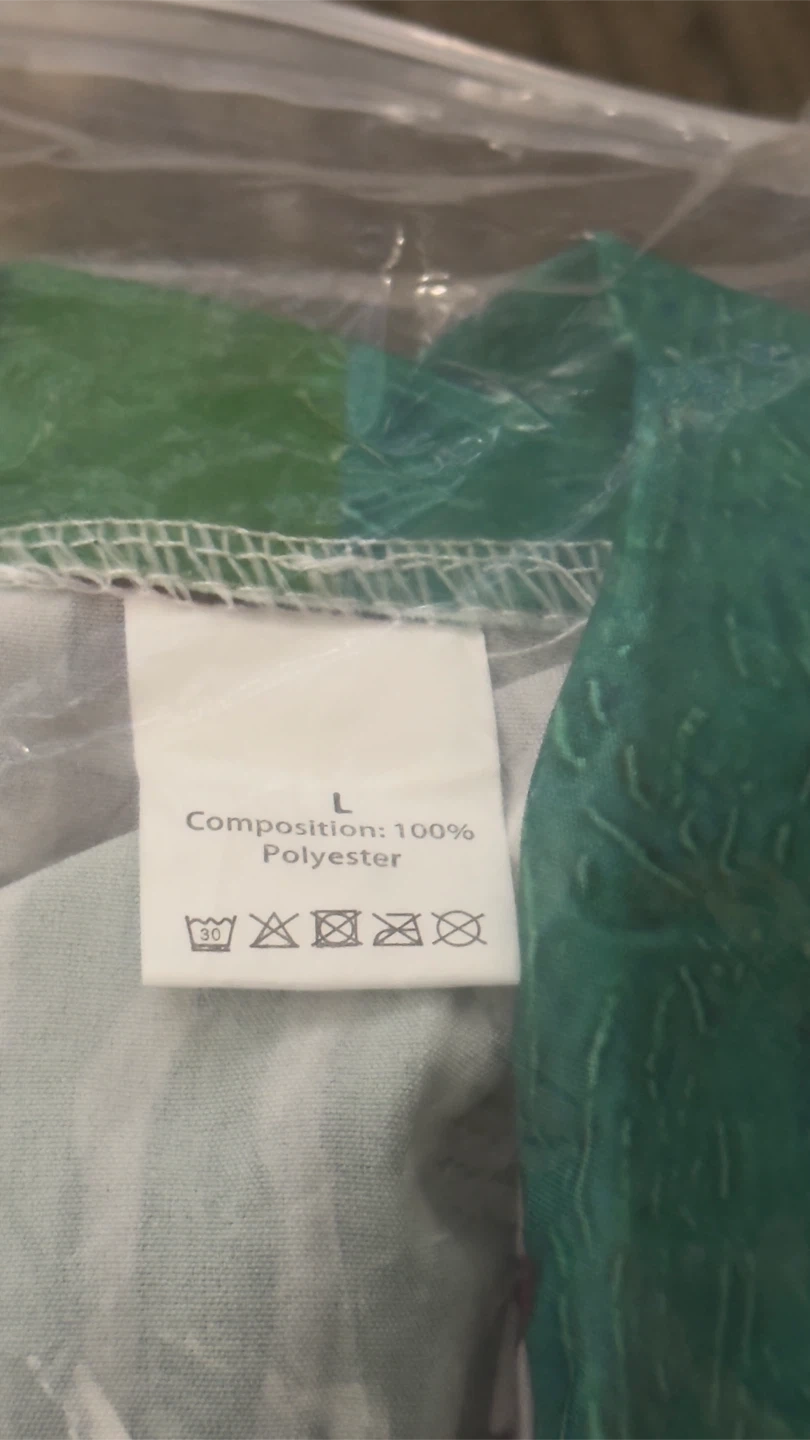 This is a polyester shirt in size L. It's made of 100% polyester. Available for local pickup by Schaumburg and Barrington Road in Schaumburg IL 60194 or shipping to your doorstep for one low price with tracking included for free. Comes from a virus free, smoke free and pet free home.