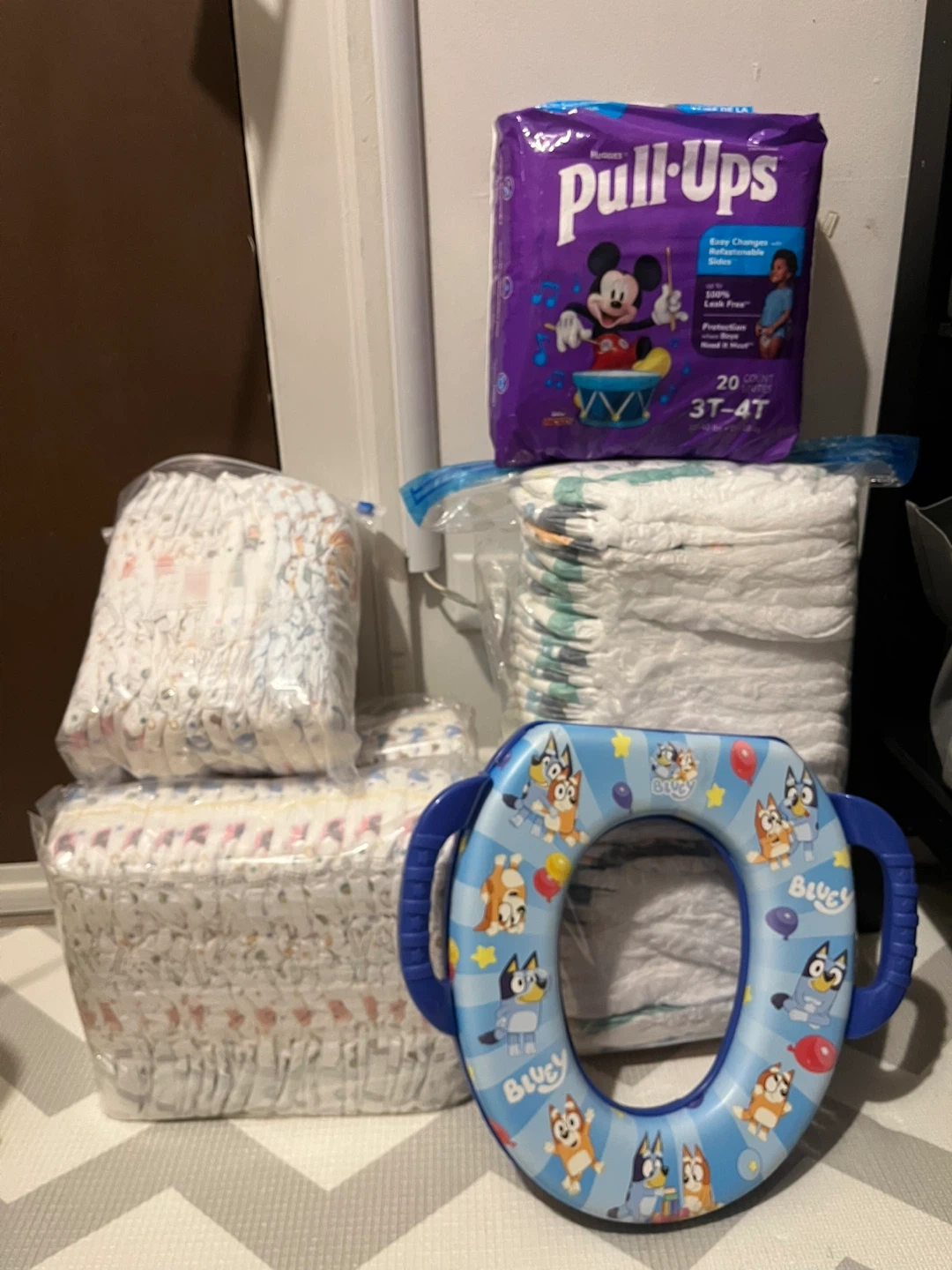 Bundle includes Huggies and Pull-Ups diapers in size 2T. Also includes various toddler shoes, clothing, puzzles, and a bluey potty training seat. Items are in good condition. Diapers are 7 and pull ups in size 5. $100 for everything but willing to sell individually. For more info or pictures send a message