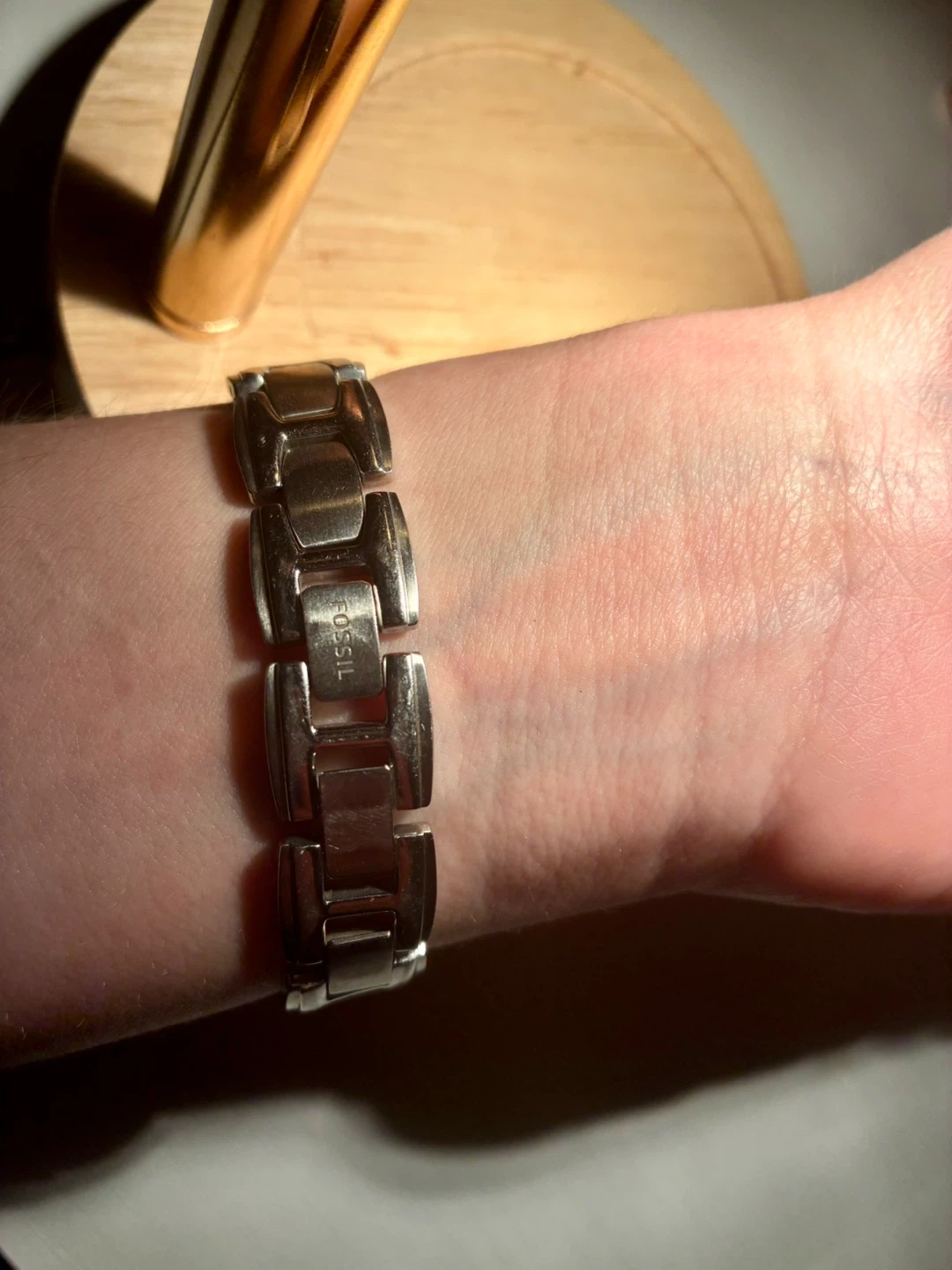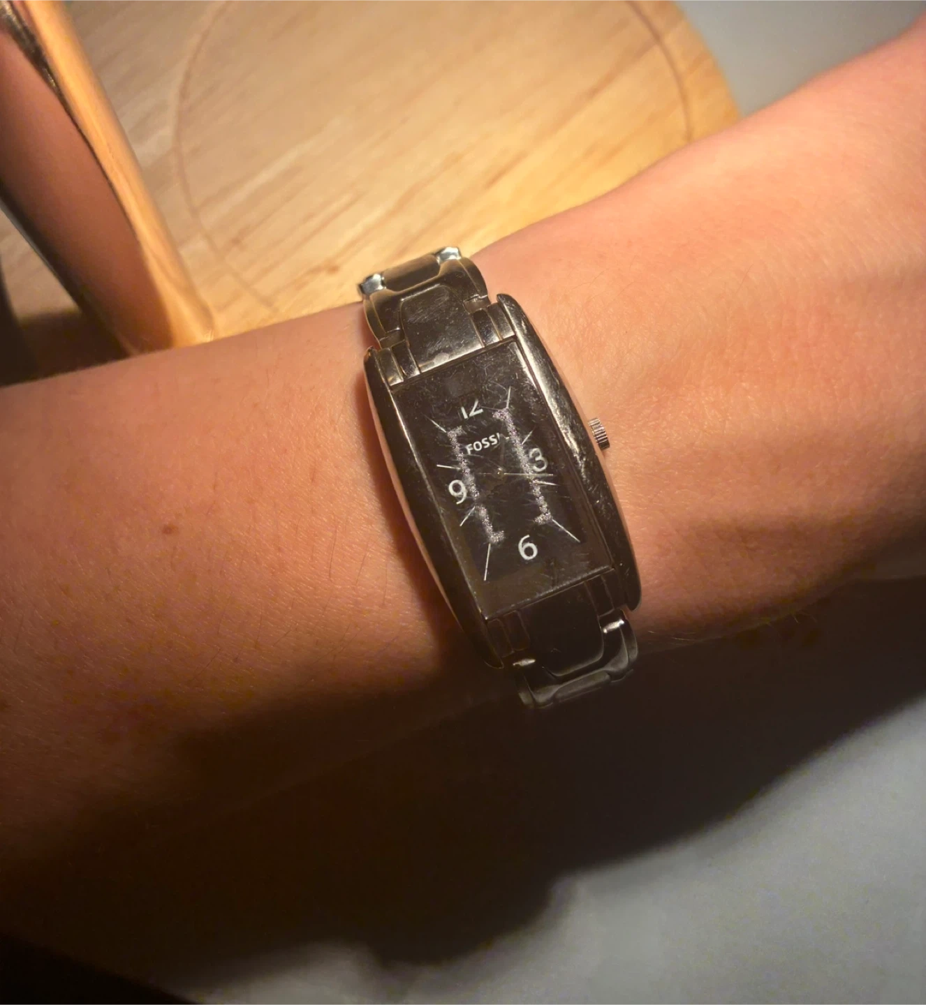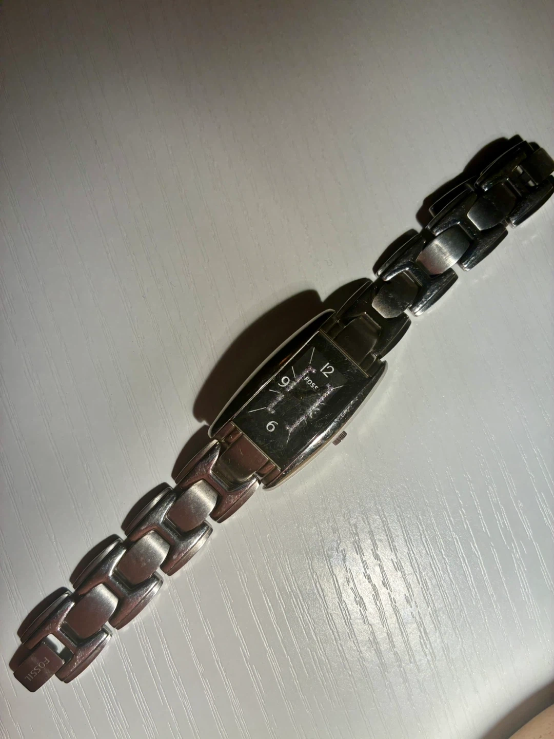This is a Fossil women's watch with a rectangular face and a stainless steel band. The watch has a silver-tone metal bracelet. It features Arabic numerals at the 12, 3, 6, and 9 o'clock positions. Great for everyday wear!