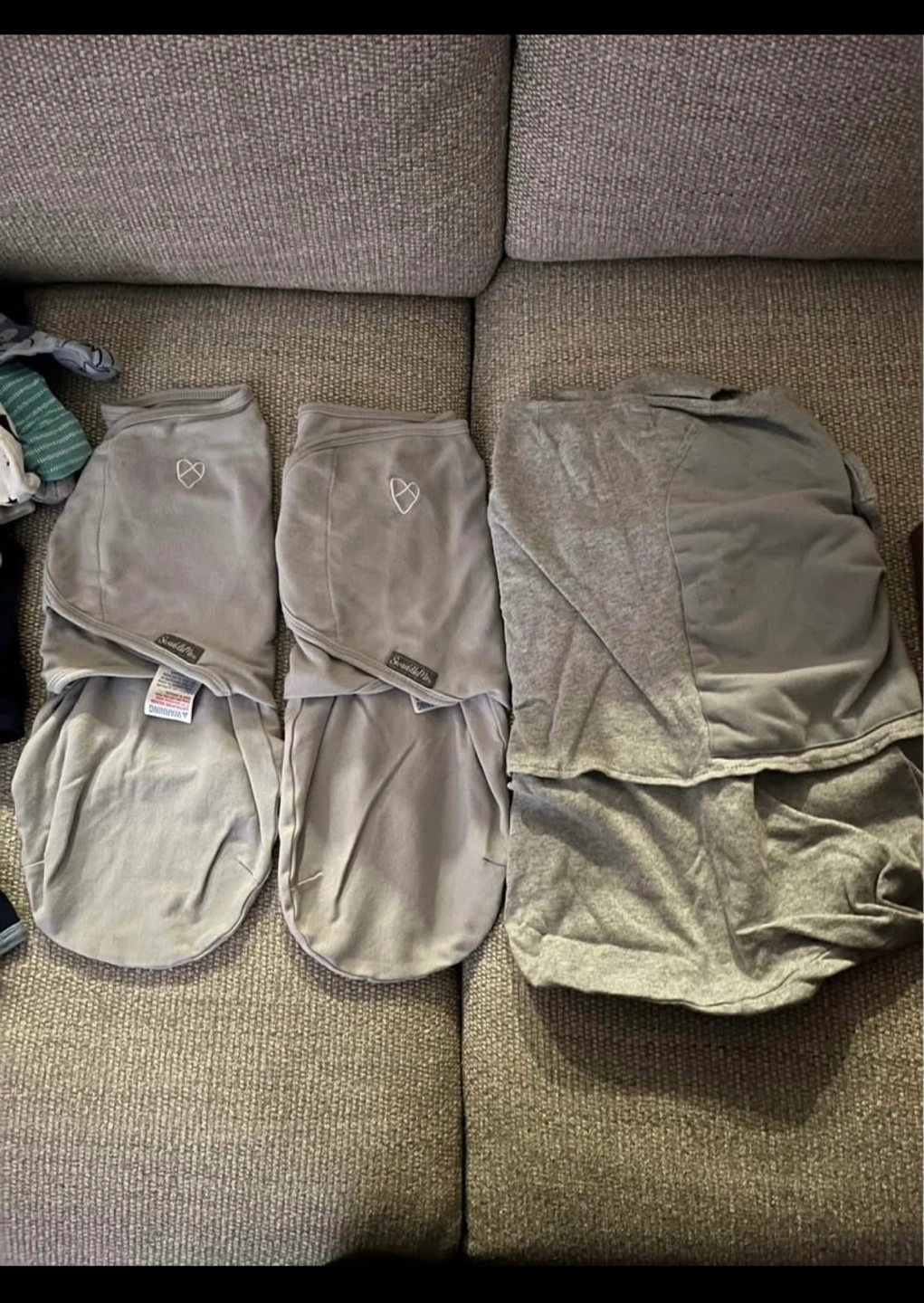 Soft gray swaddles. Each swaddle has a heart shape emblem. They are perfect for helping little ones sleep soundly and feel secure.