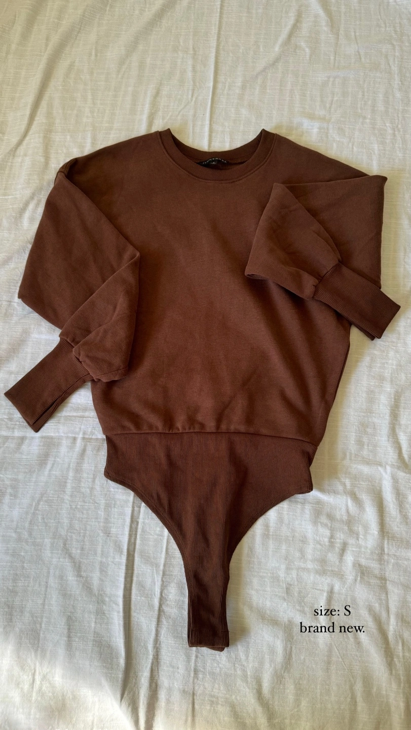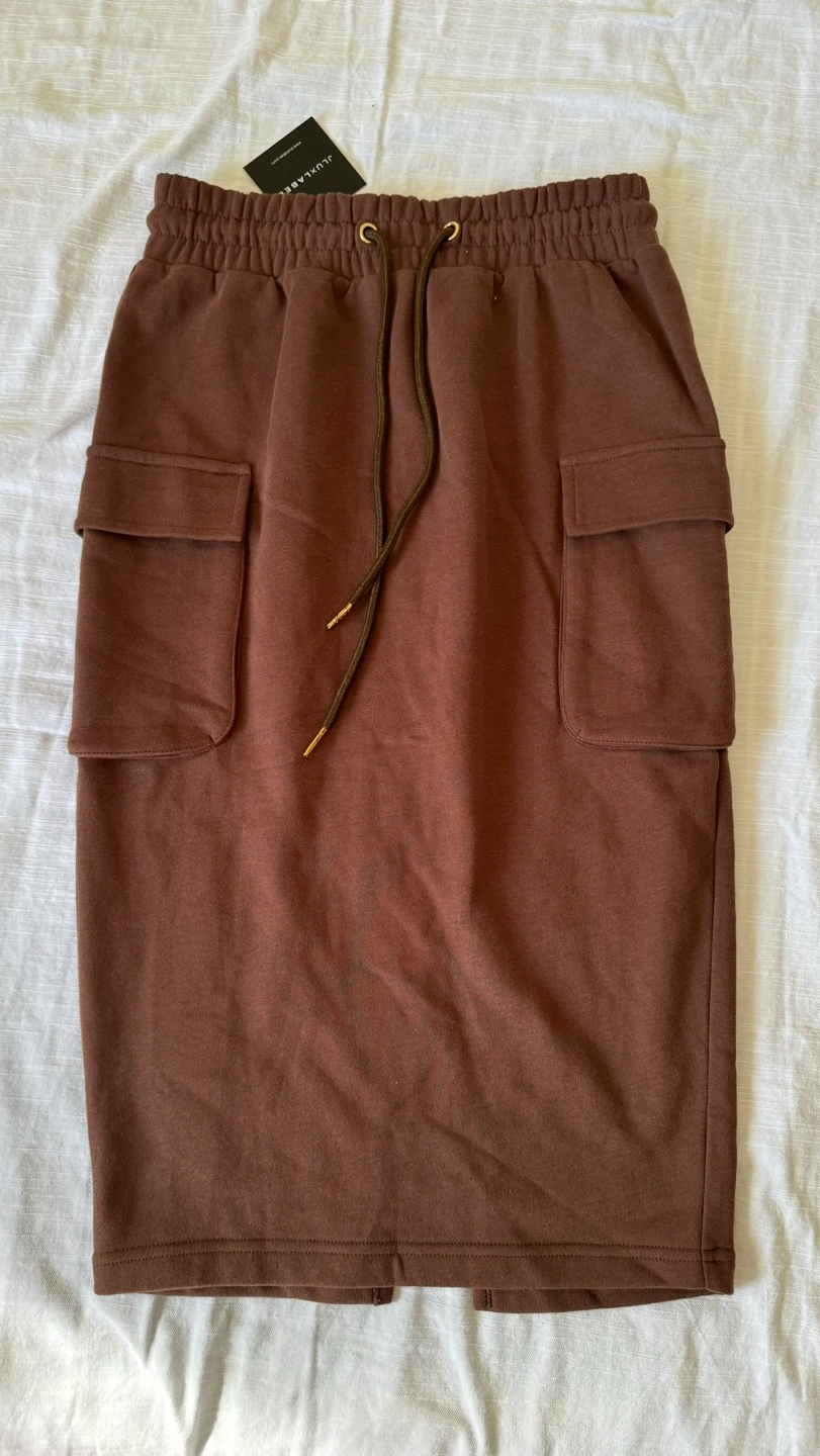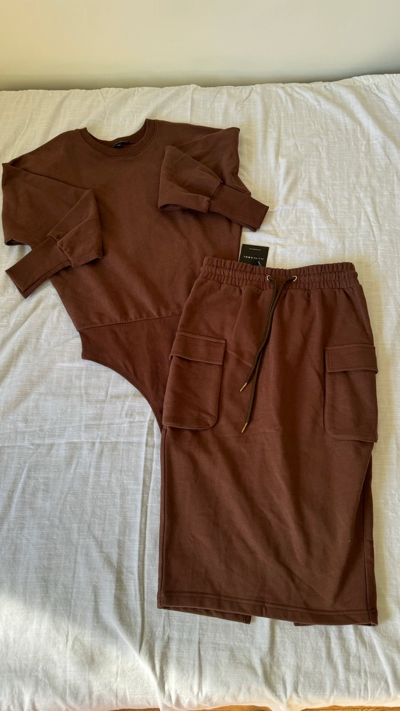 16Brand new, brown two-piece set. Includes long-sleeve bodysuit and midi cargo skirt. Soft material. Drawstring waist on skirt. Size small.