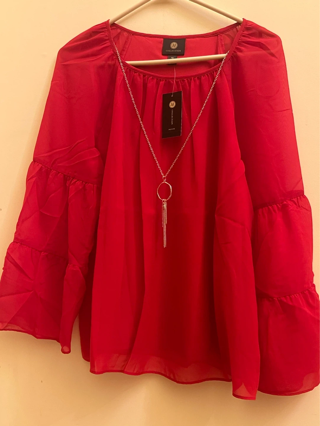 20Selling a JM Collection blouse in a vibrant red color. It's a size PM (Petite Medium) and features stylish, flowy sleeves. Comes with a necklace as pictured!