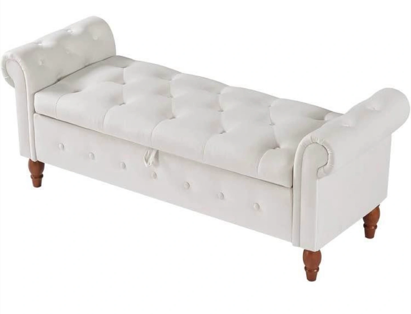 Storage bench with a tufted seat. Upholstered in a light color fabric. The bench has rolled arms and a storage compartment underneath the seat. This bench is great for organizing your belongings and bringing a sense of calm to your space.