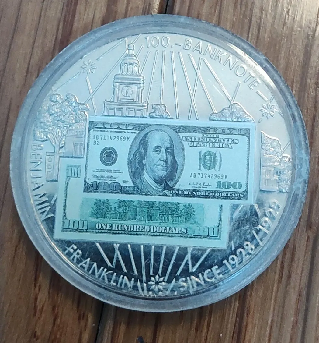 This coin features a depiction of Benjamin Franklin and the 100 dollar banknote. It includes text stating "100 Banknote" and "Benjamin Franklin Since 1928 1929". The coin appears to be made of silver-toned metal.