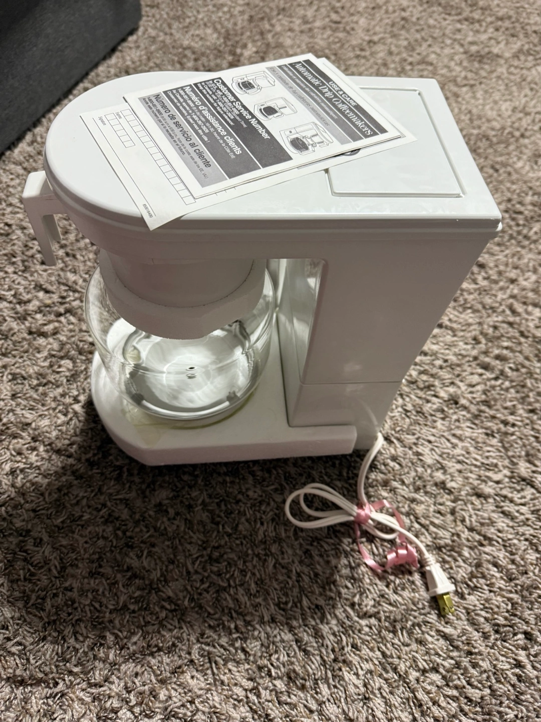 White coffee maker. The coffee maker has a glass carafe. It could be a great way to start your day with the perfect cup of coffee.