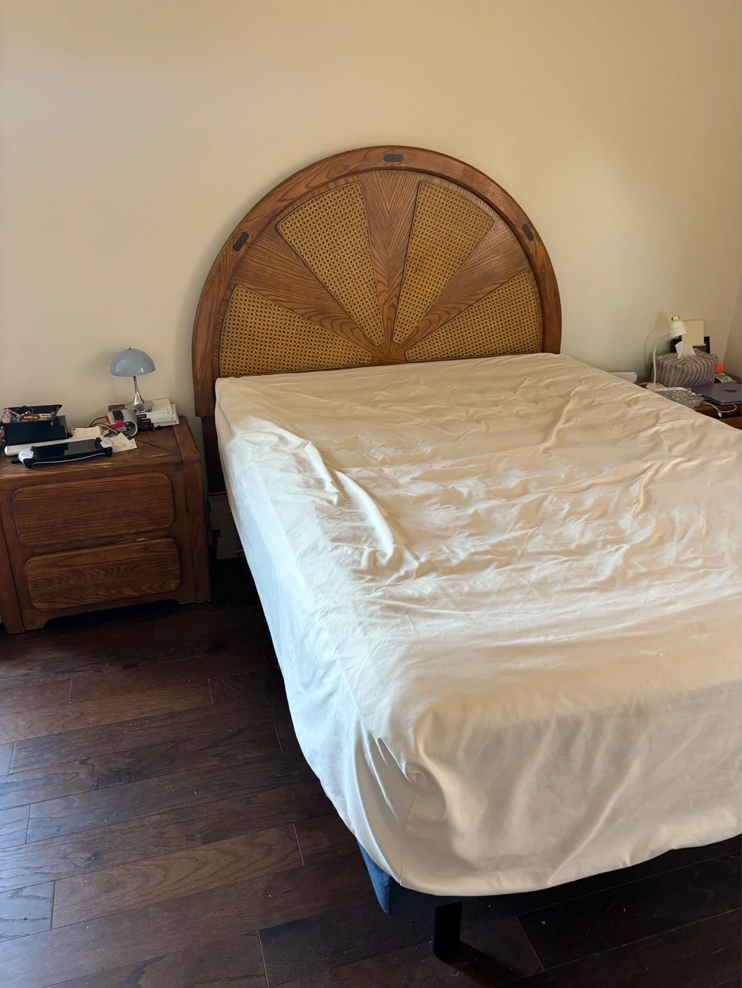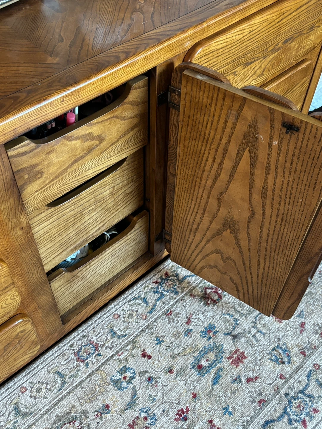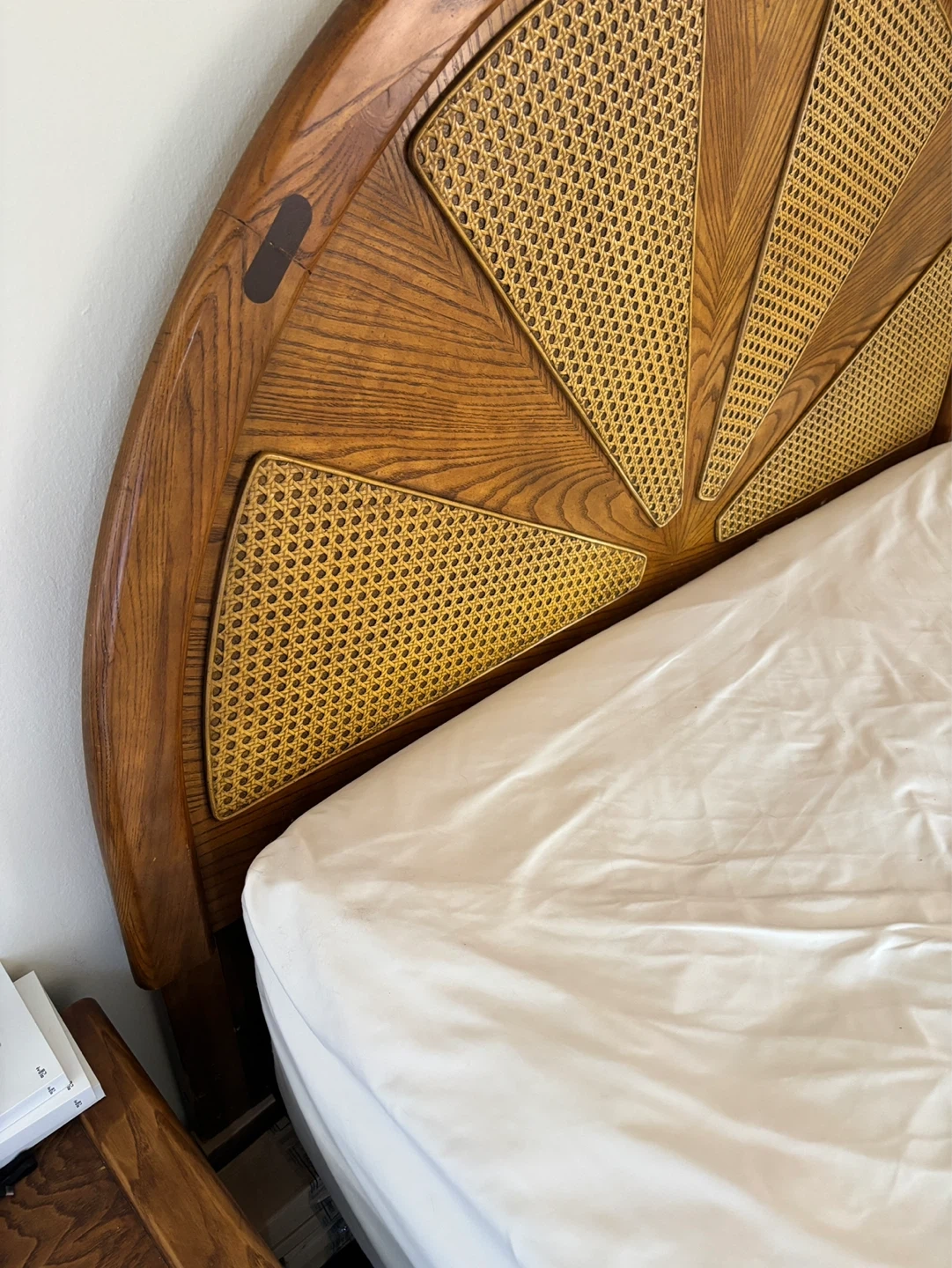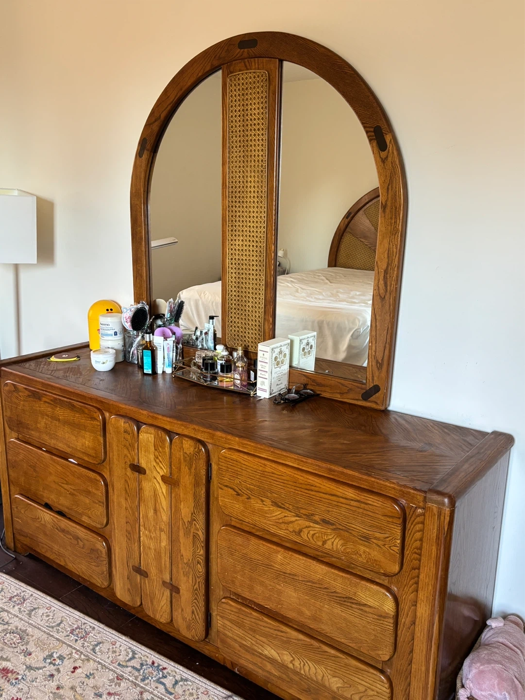 This dresser features a warm wood finish with woven cane detailing on the arched mirror and headboard. It offers ample storage with multiple drawers and cabinet space. A stylish piece for any bedroom!