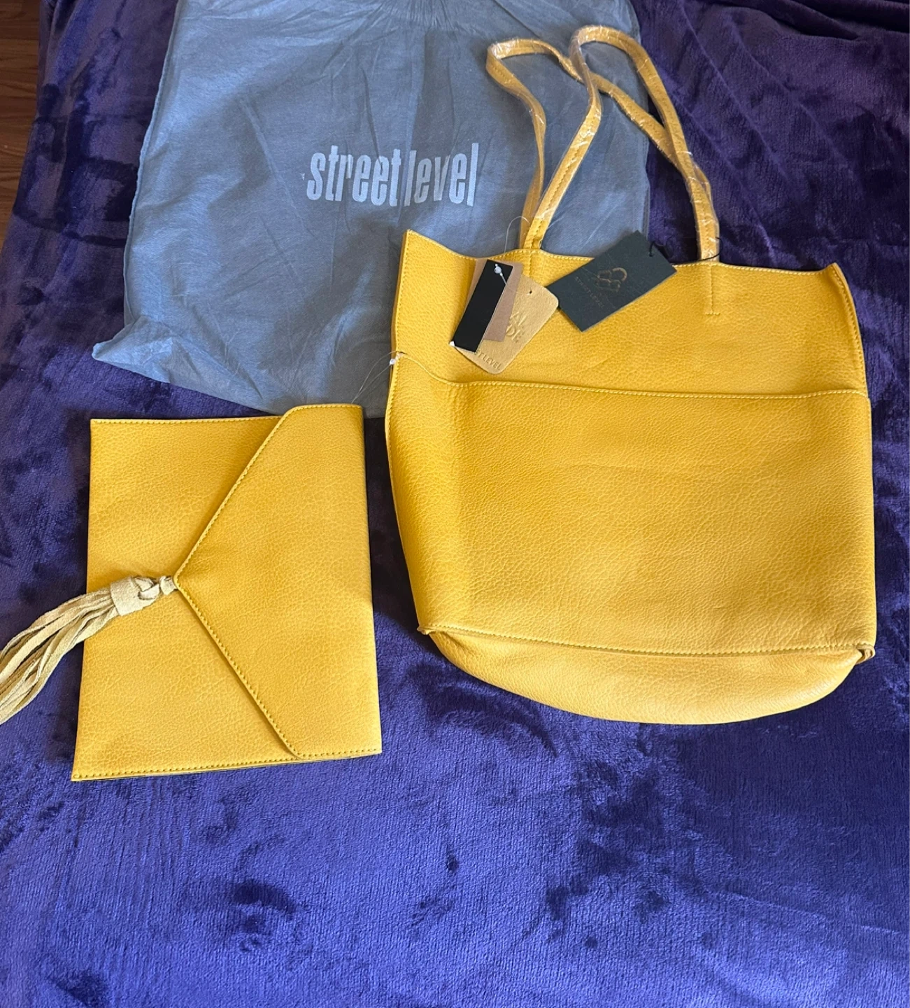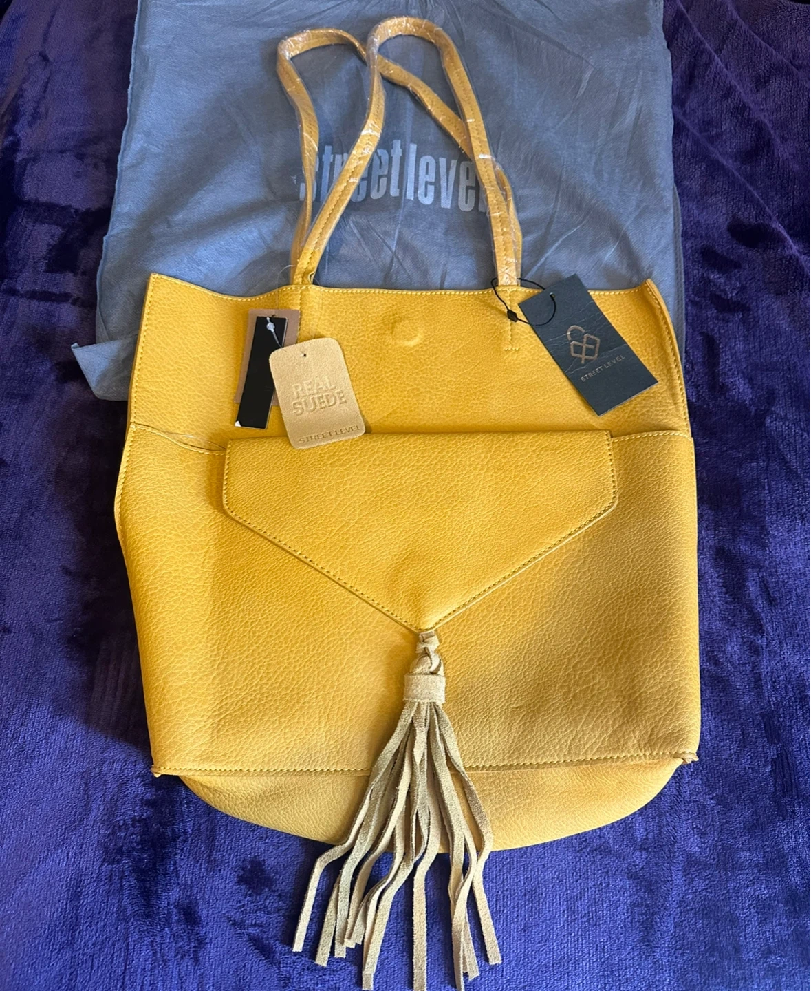 Yellow tote bag made with real suede. Includes a matching clutch with a tassel detail. The bag has a front pocket and a snap closure. Comes with a dust bag for storage.