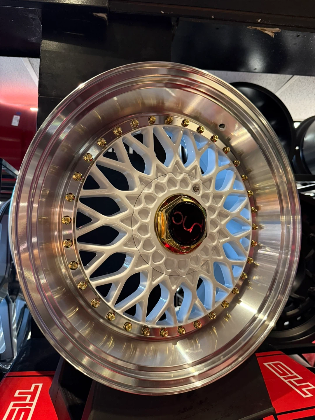 10Selling a set of used white wheels. They have a silver rim and gold accents.