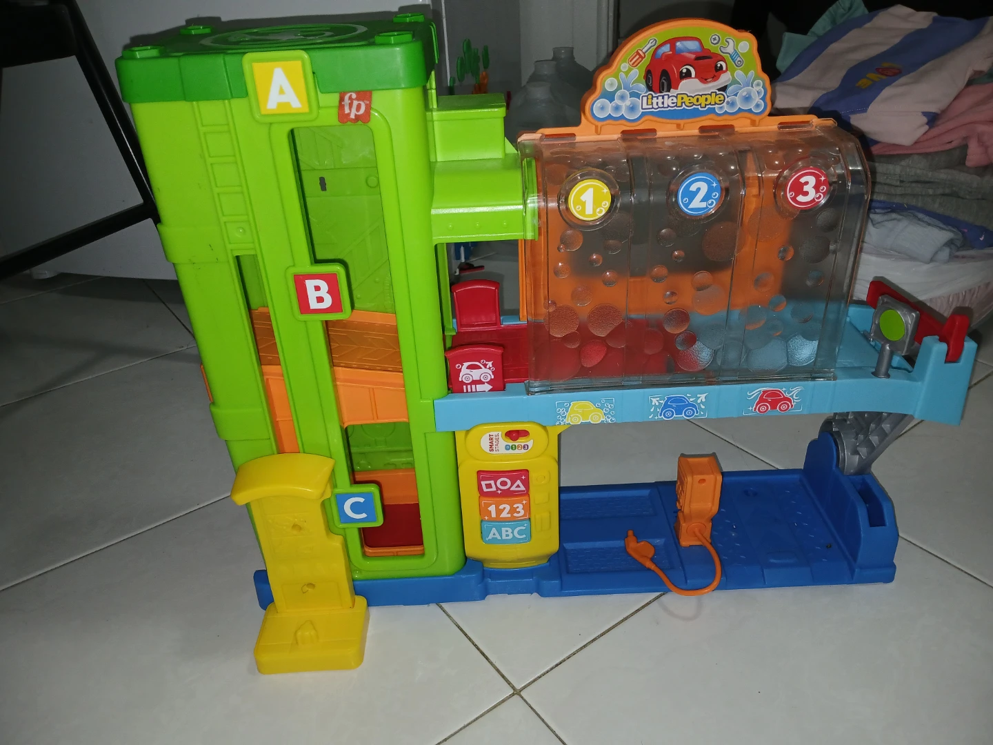 Fisher-Price Little People car wash playset. It's a fun toy for kids. Includes ramps, car wash area with numbered stations, and a fueling station.