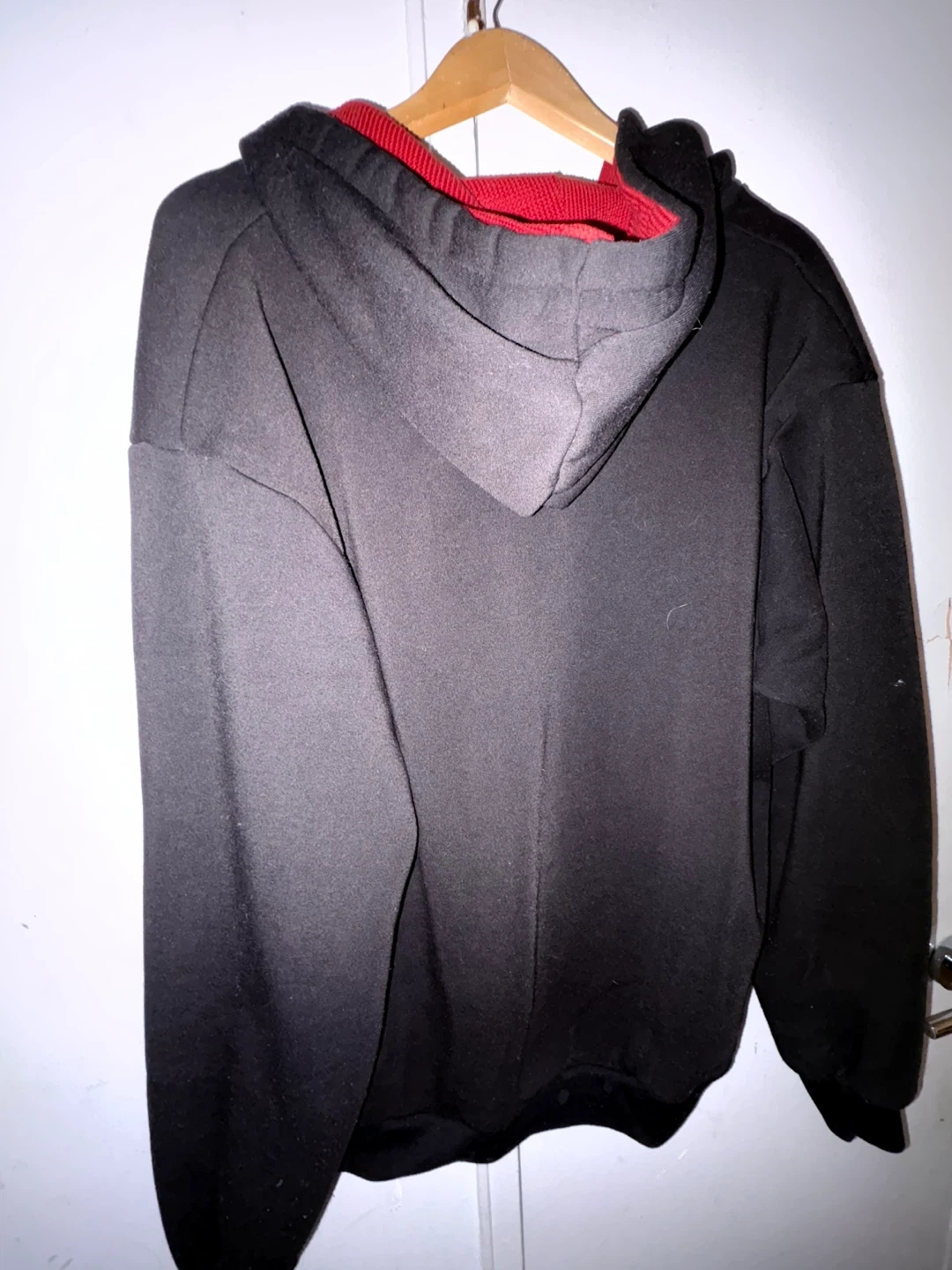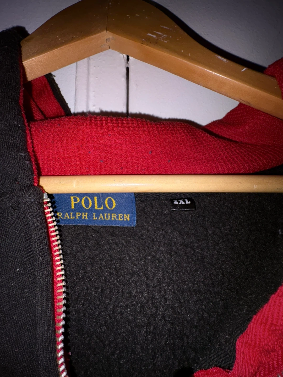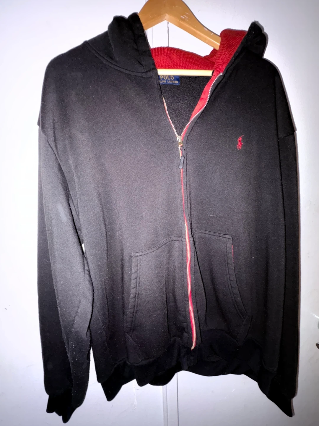 Black zip-up hoodie from Polo Ralph Lauren with a red interior lining. Size is 2XL. This hoodie has a full zip closure and front pockets. It's great for casual wear or layering! Hoodie missing the string of the Hood.