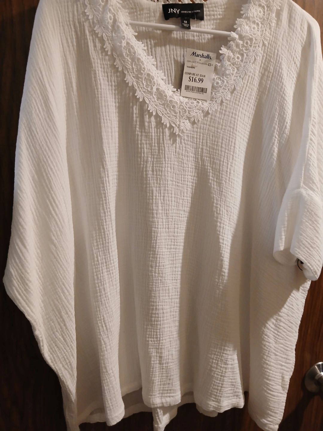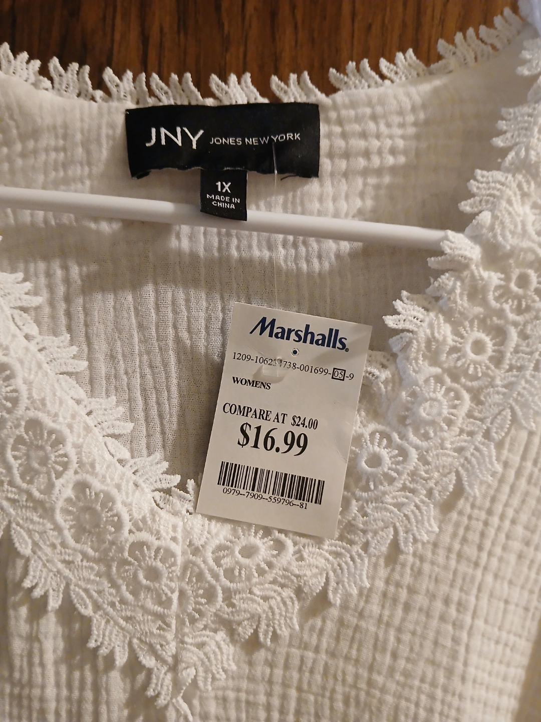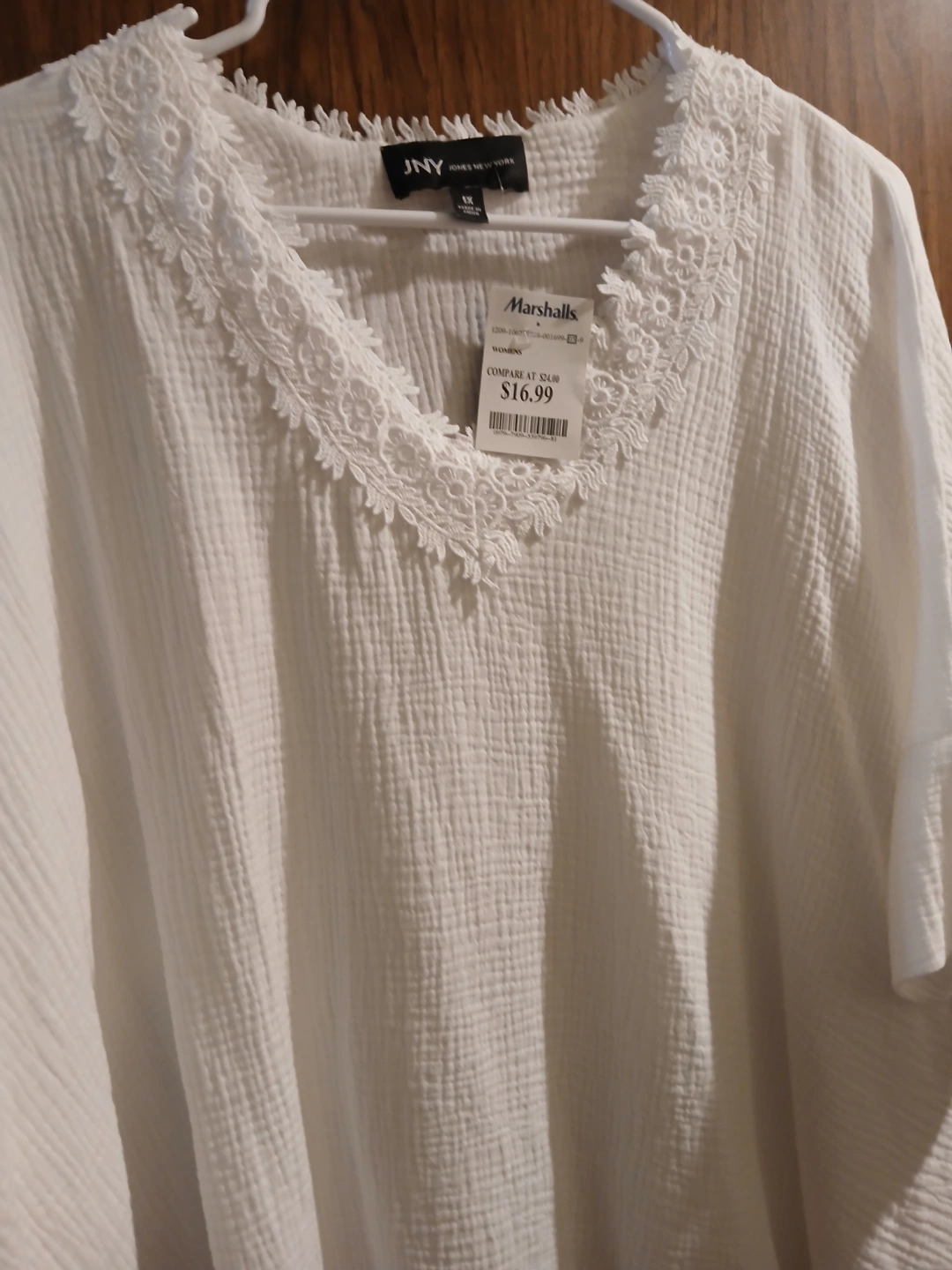 White cotton gauze blouse. Lace trim neckline. Short sleeves. Size 1X. New with tags. runs very large