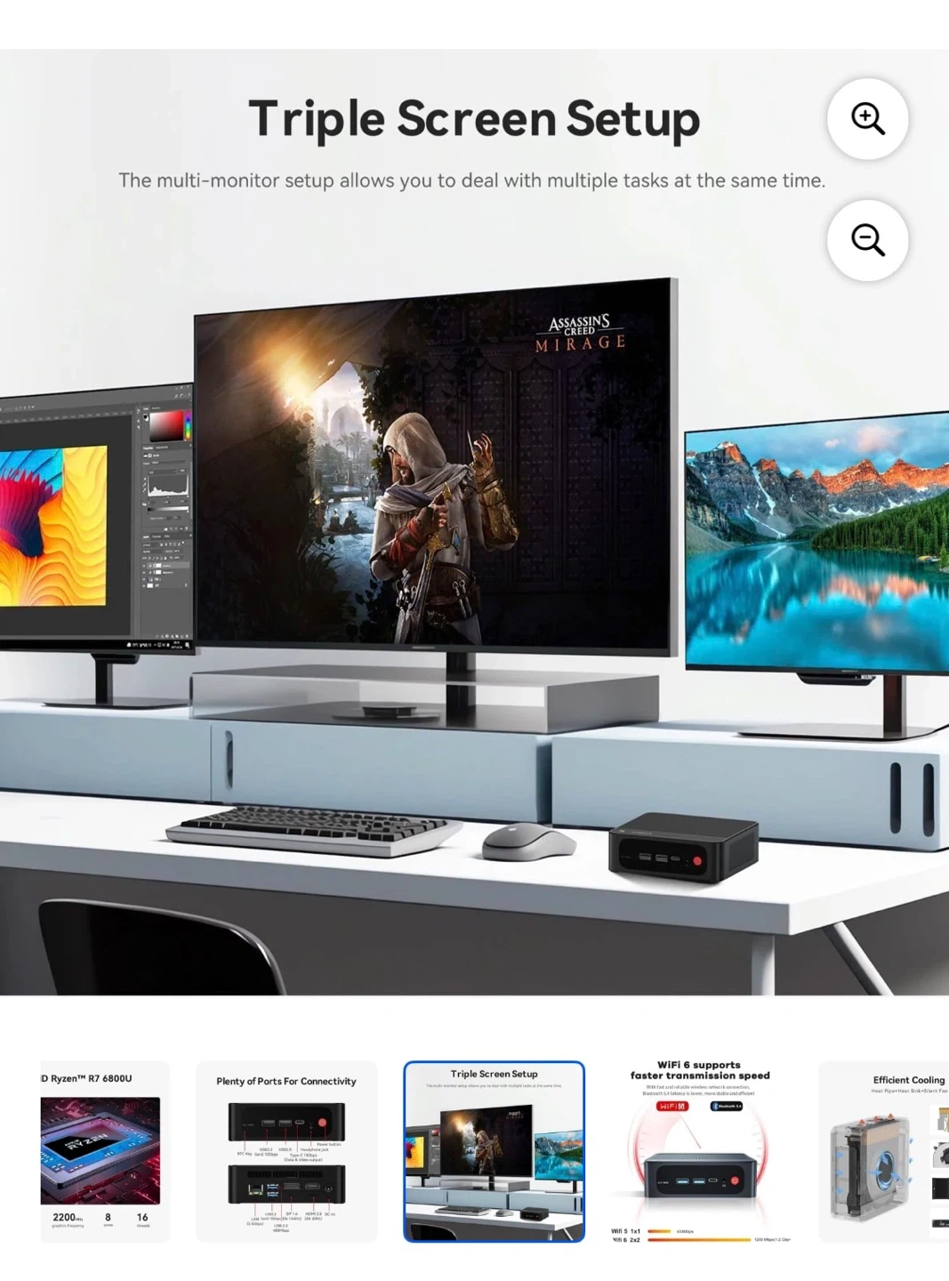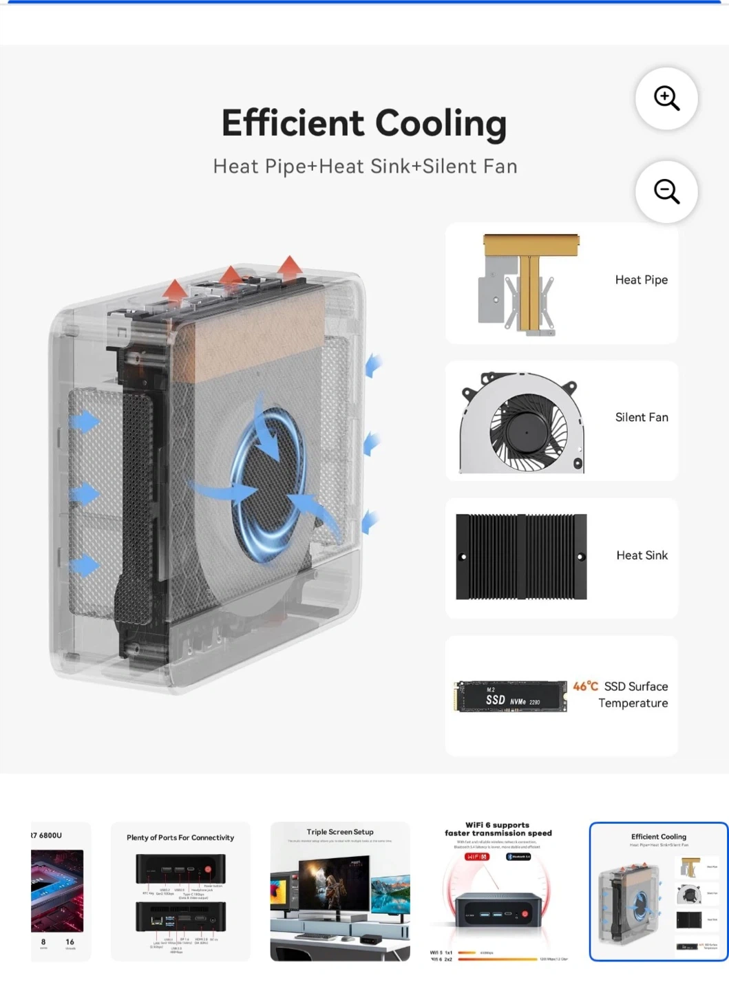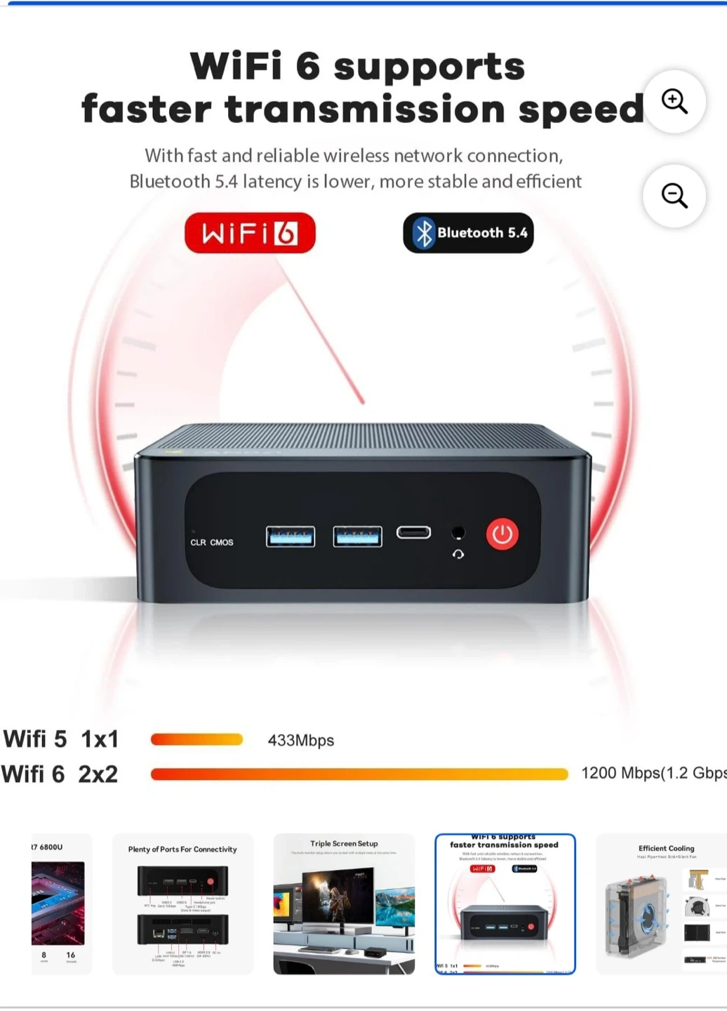 It supports a triple screen setup and has efficient cooling with a heat pipe, heat sink, and silent fan. It also supports WiFi 6 for faster transmission speed!