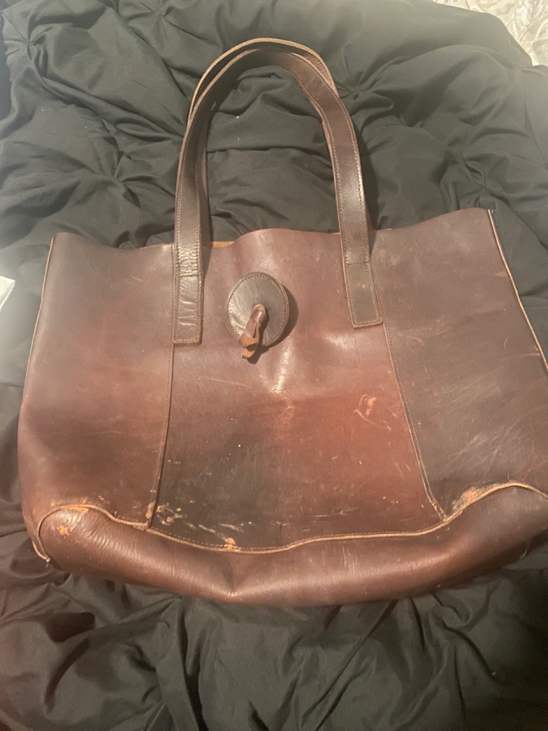 I'm selling a used genuine leather tote bag. It shows some signs of wear, as pictured.