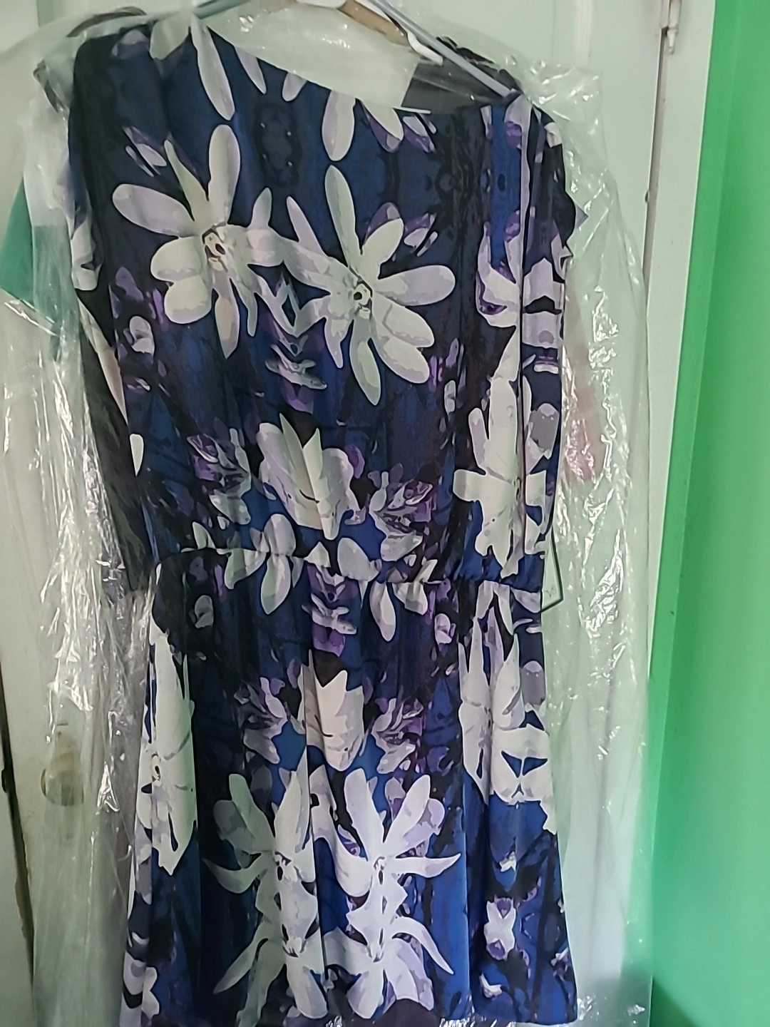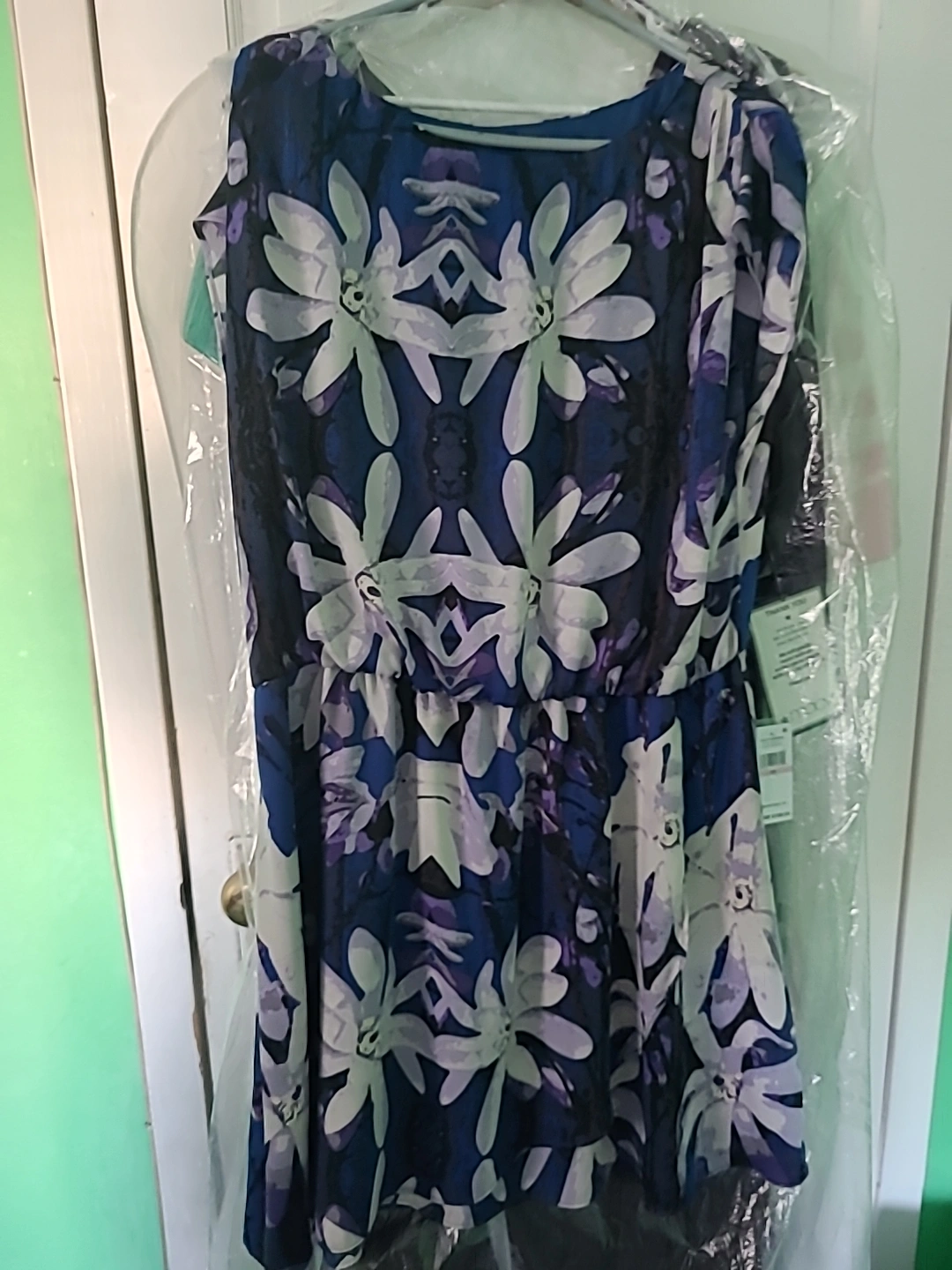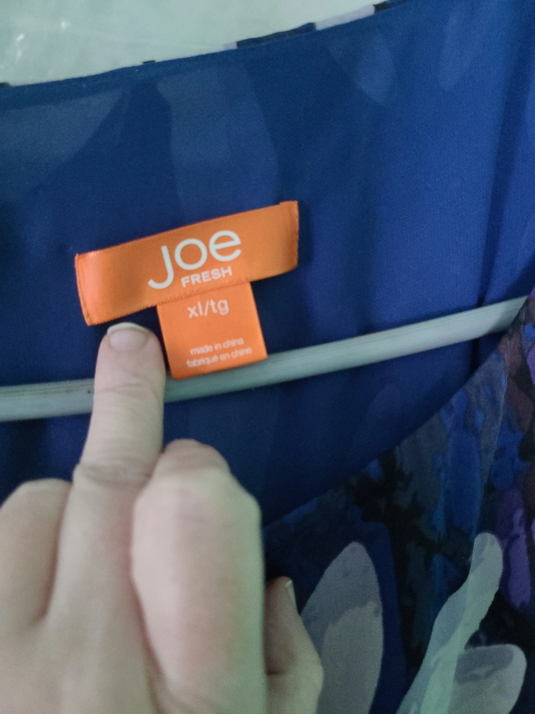 Beautiful Joe Fresh dress with a floral pattern in shades of blue, purple, and white. It's a size XL and in great condition. The care instructions are: machine wash cold, gentle cycle, do not bleach, hang to dry, cool iron if needed