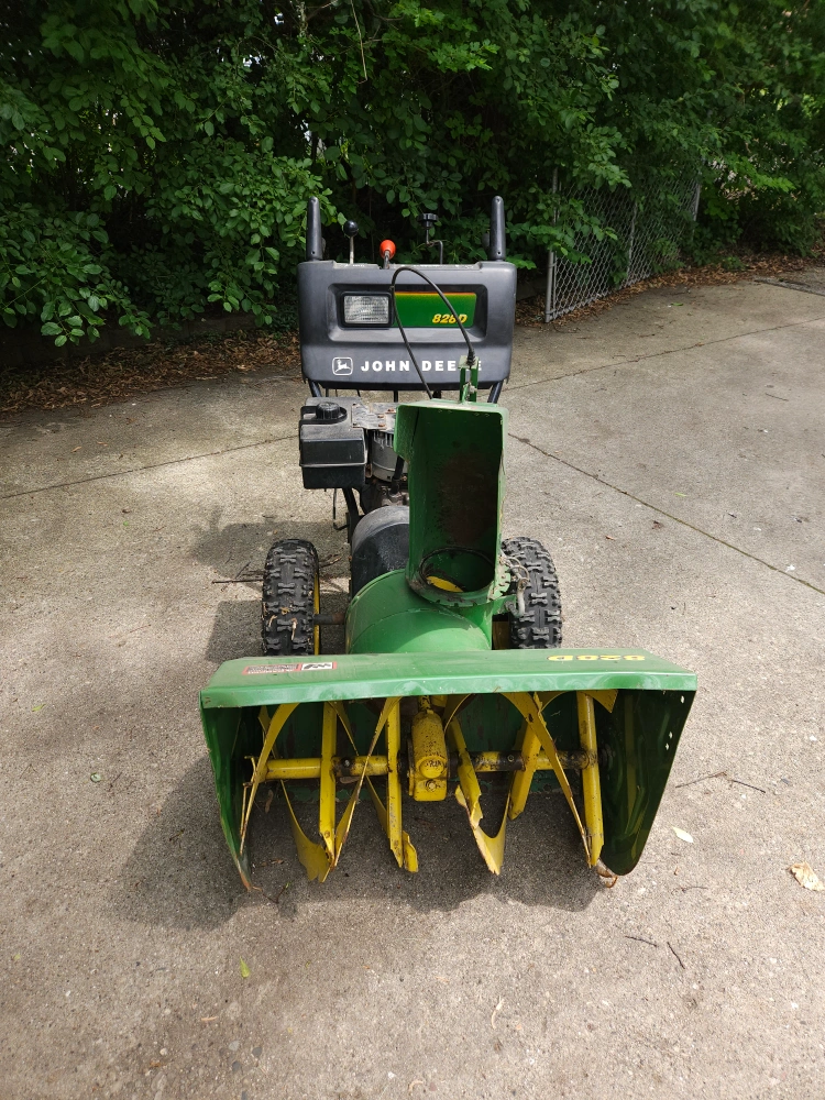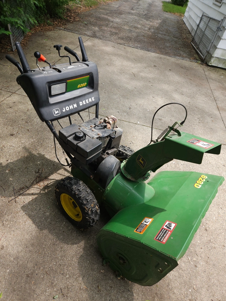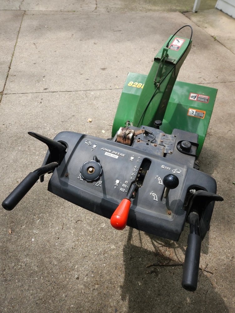 Green and black snowblower. Features a large chute. Controls with red and black levers and knobs. A great help during the winter months.