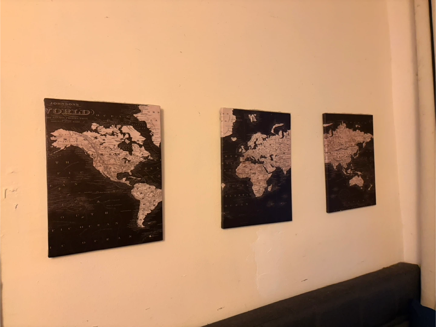 Selling a set of three Johnson's World map wall art pieces. They're in great condition and would look great in any room! The set includes three panels, each depicting a different region of the world. Perfect for adding a touch of vintage charm to your home