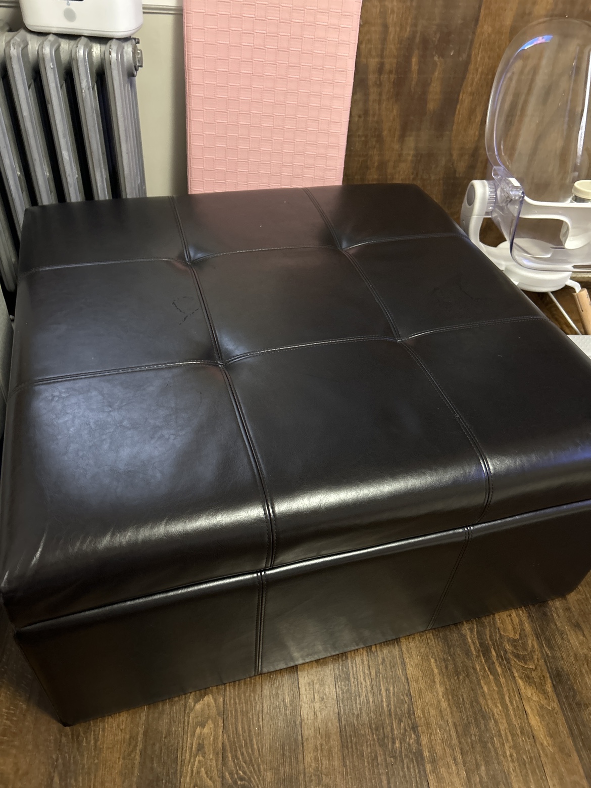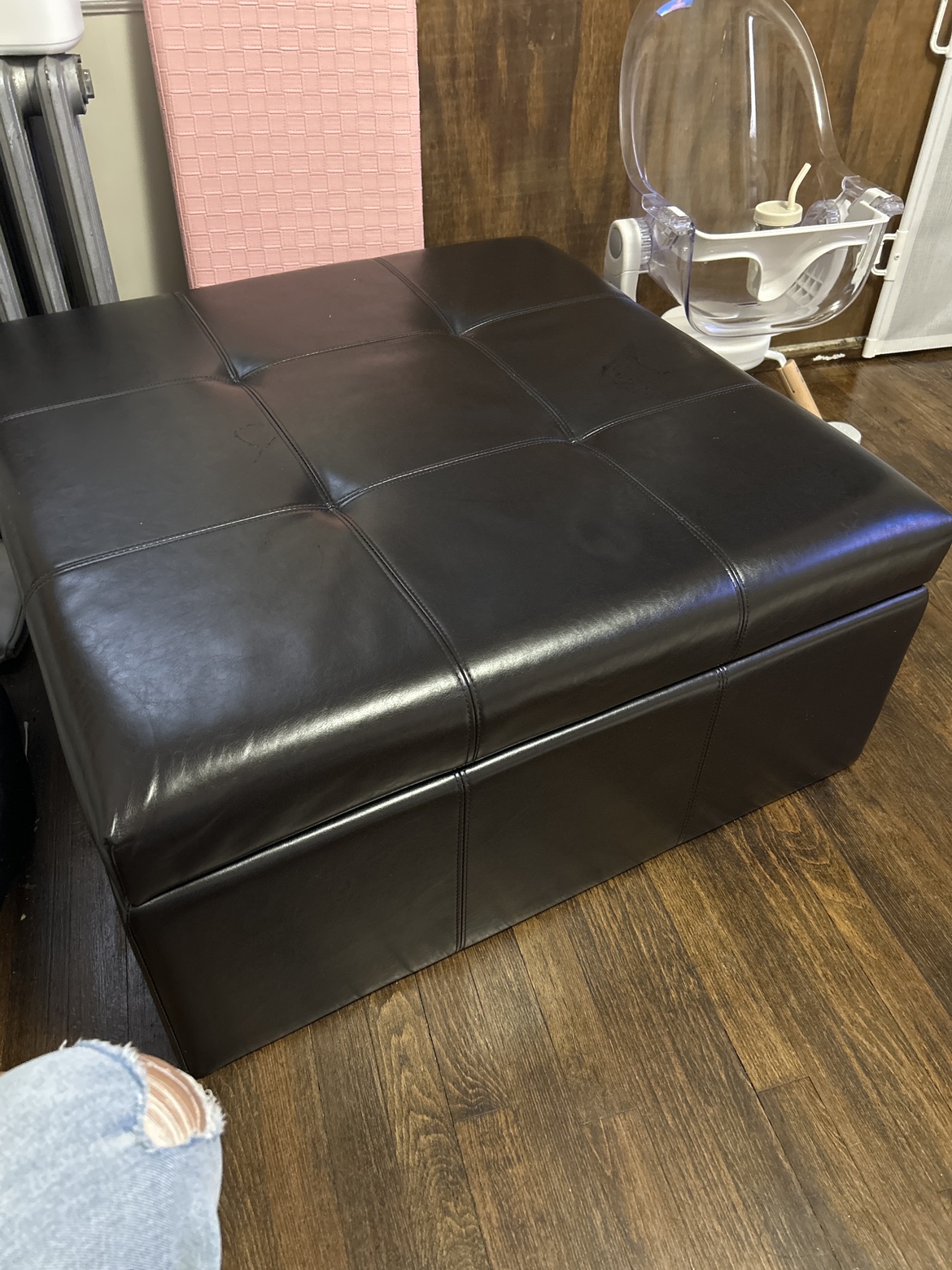 Large black storage ottoman with a tufted top. Perfect for extra seating or hiding items!