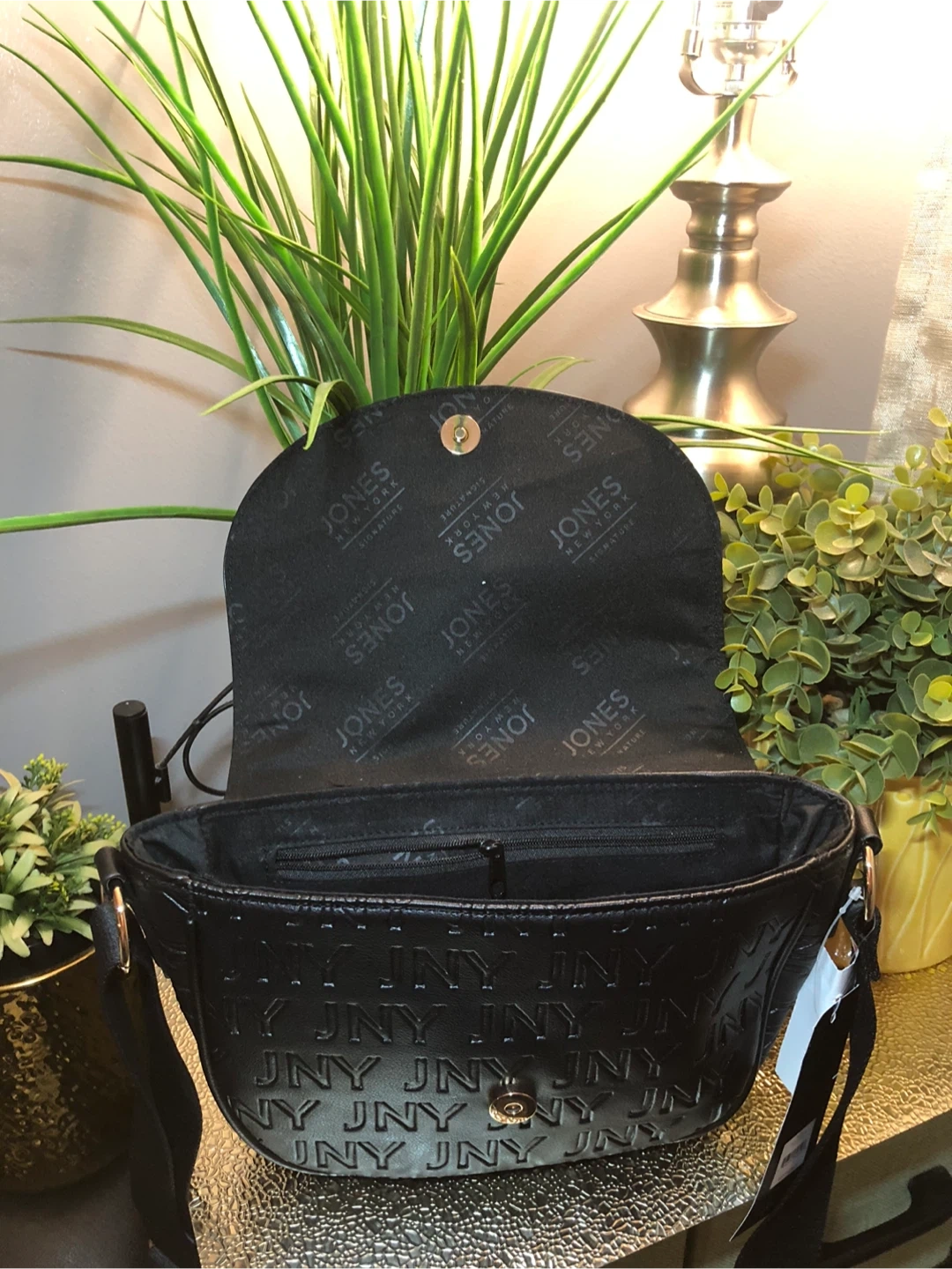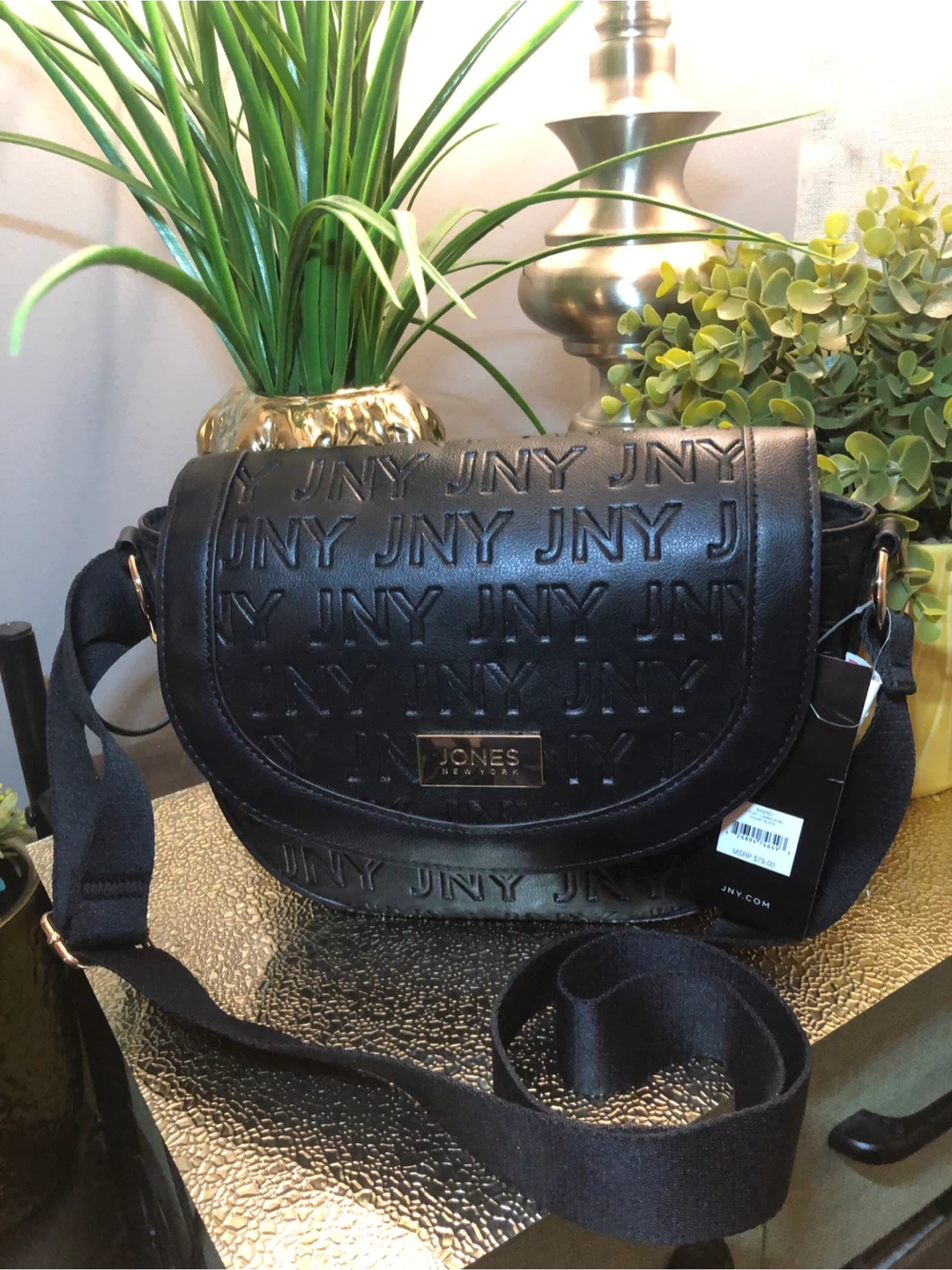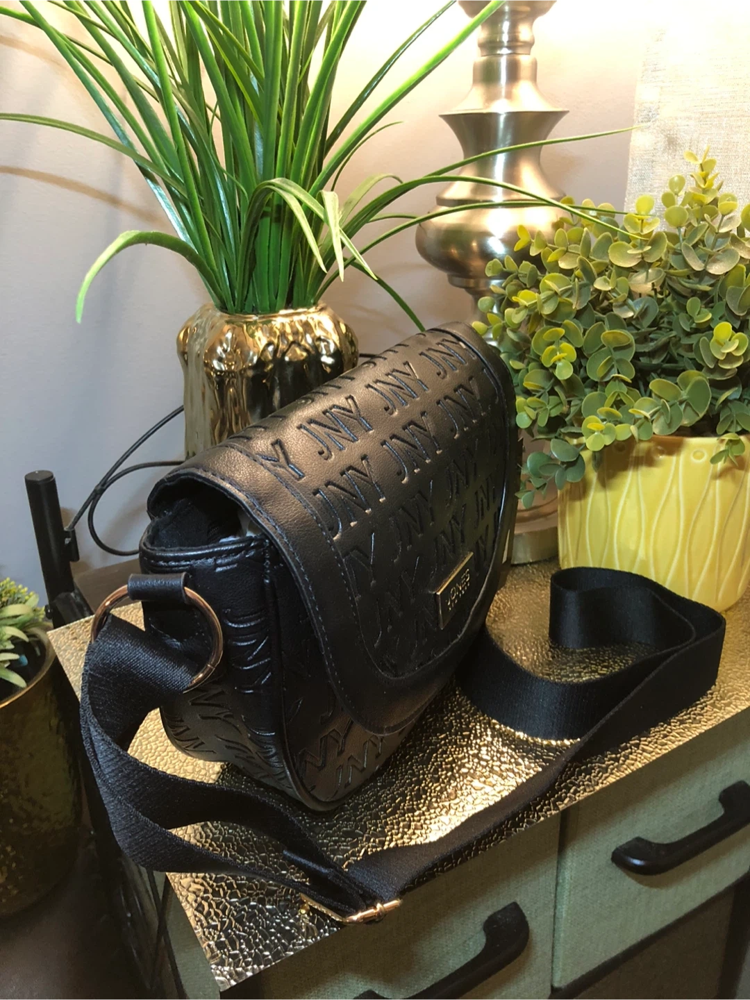 This is a stylish black crossbody bag from Jones New York. It features the JNY logo embossed all over. The bag has a comfortable strap and is perfect for everyday use