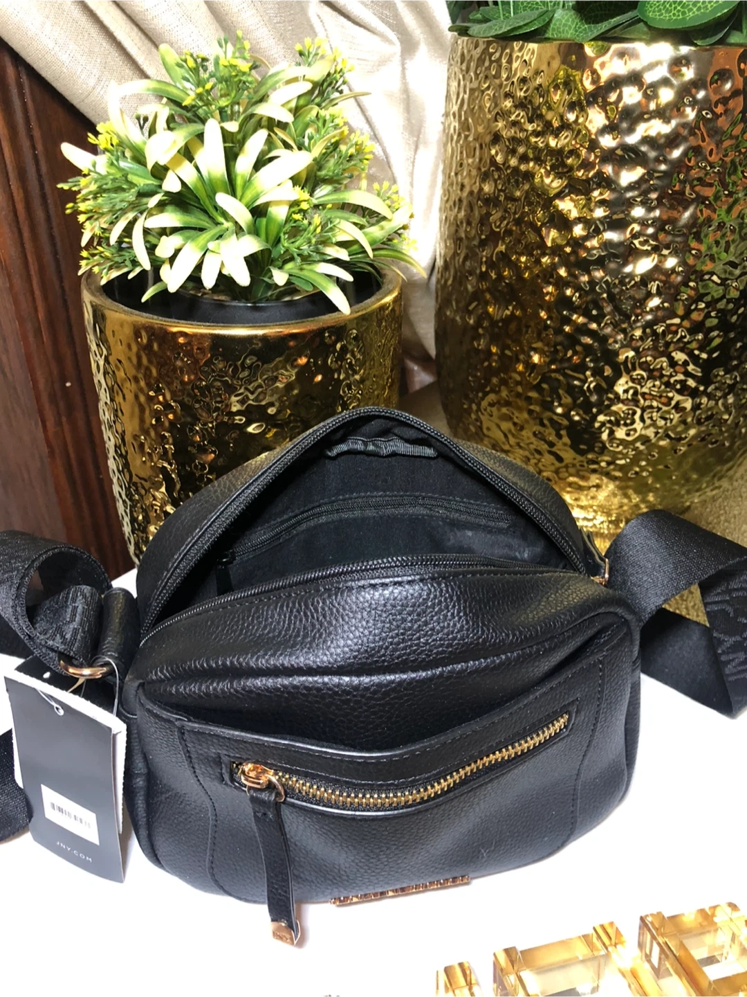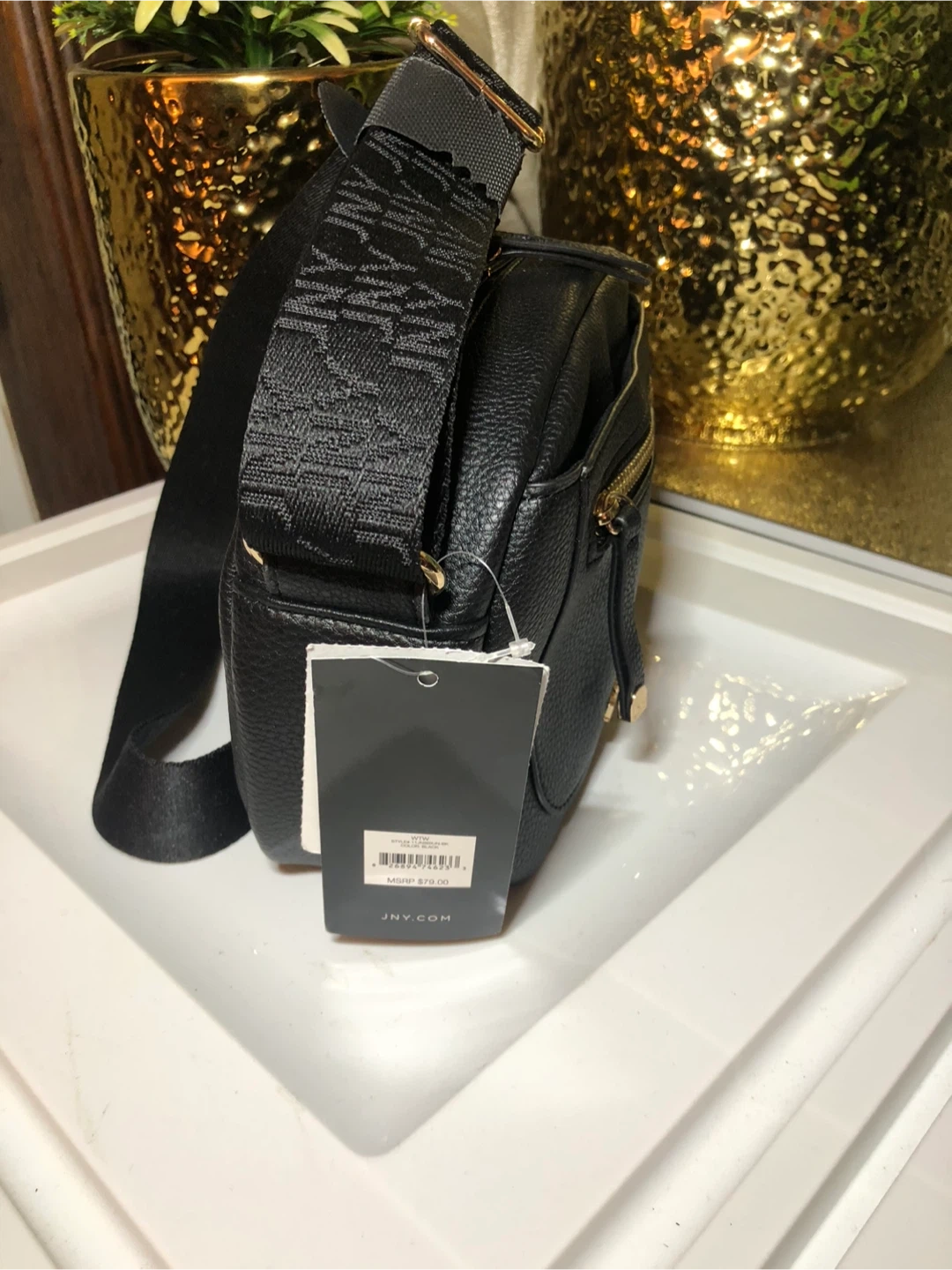 15This is a Jones New York Signature crossbody bag in black. It has a textured finish and a crossbody strap with the brand name on it. The bag has gold-tone hardware and a front zipper pocket. The tag shows an MSRP of $79