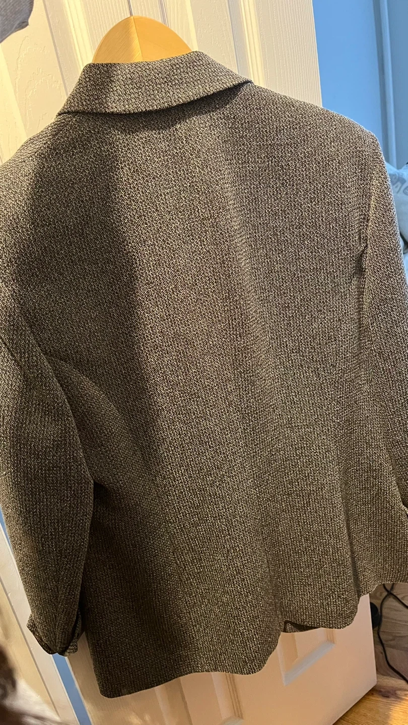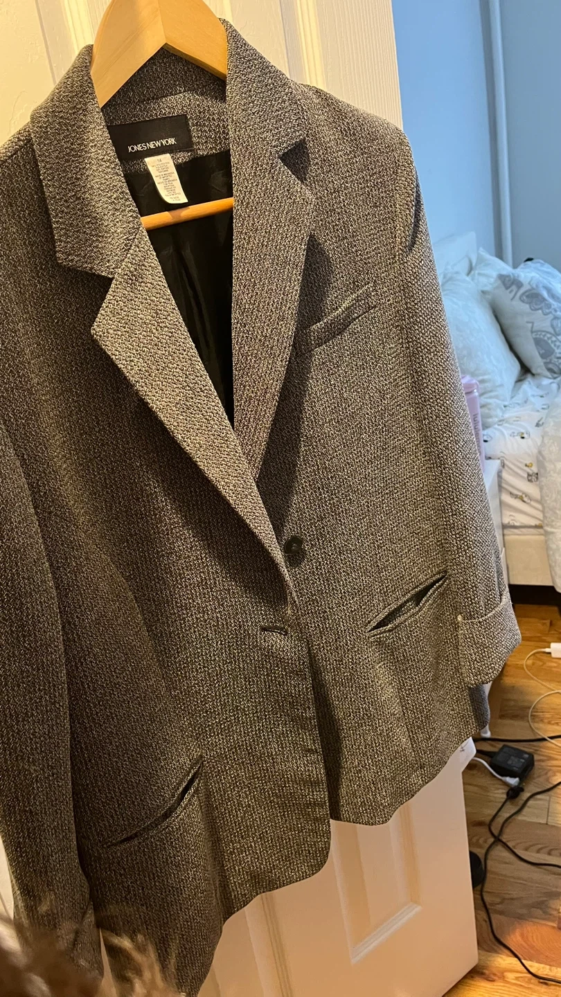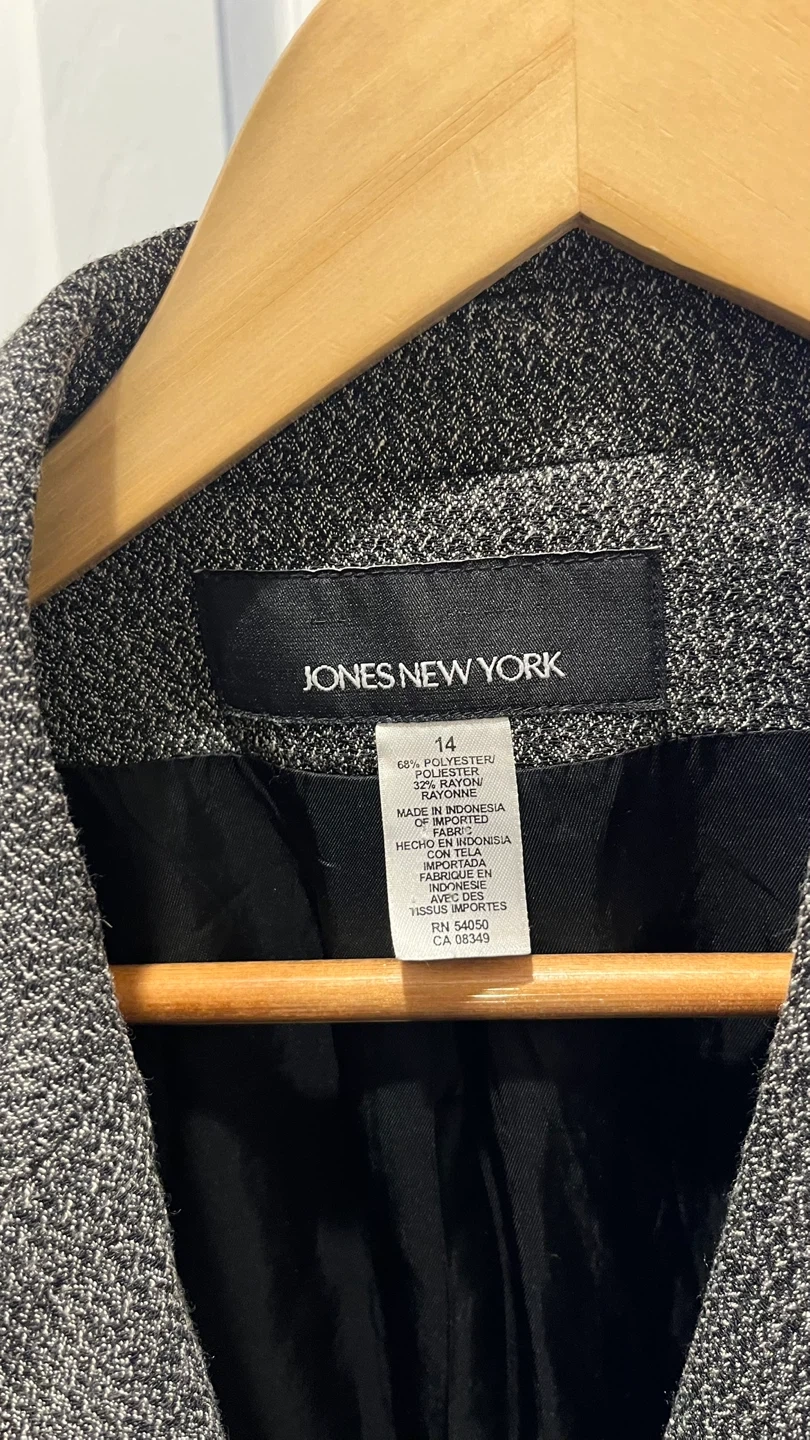65Selling a Jones New York blazer in size 14. The blazer is made of 60% polyester and 40% rayon. It has a classic look and is perfect for work or a night out