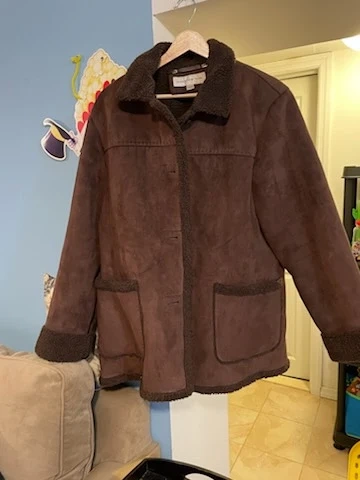 10Here's a cozy Jones New York coat in a lovely brown faux suede! It's a size L and perfect for adding a touch of warmth and style to your wardrobe. The shearling lining adds a extra warmth!