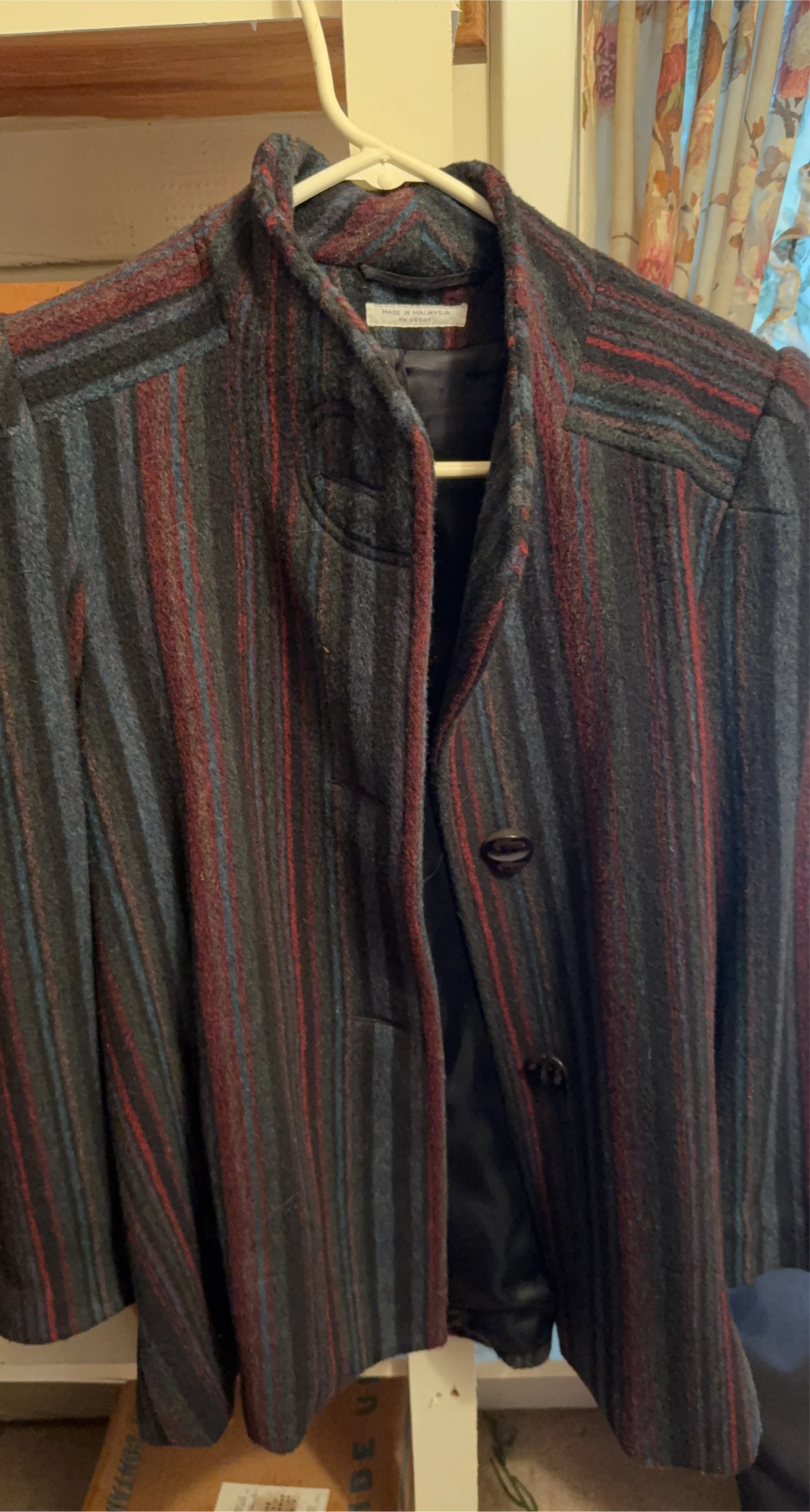 Jones New York coat with a striped pattern in shades of black, red, and blue. It's a wool blend material, perfect for keeping warm. The coat has a button-up closure and a classic design.