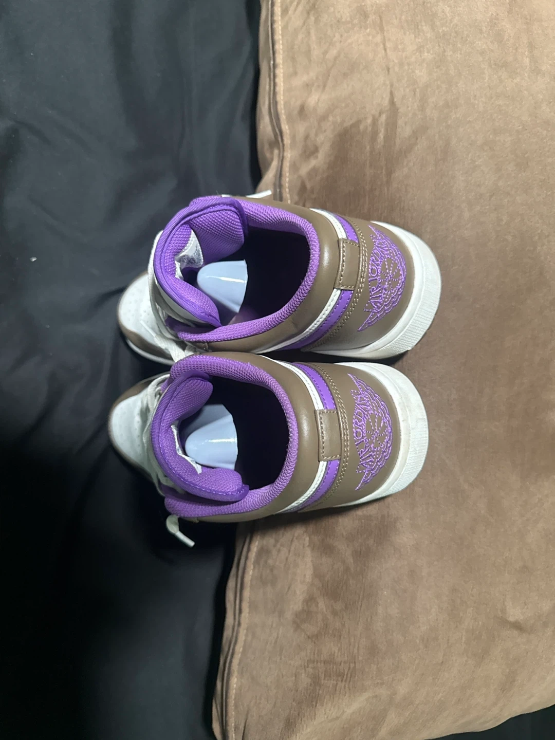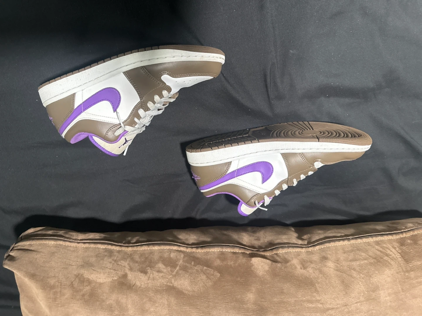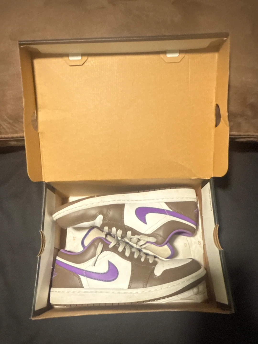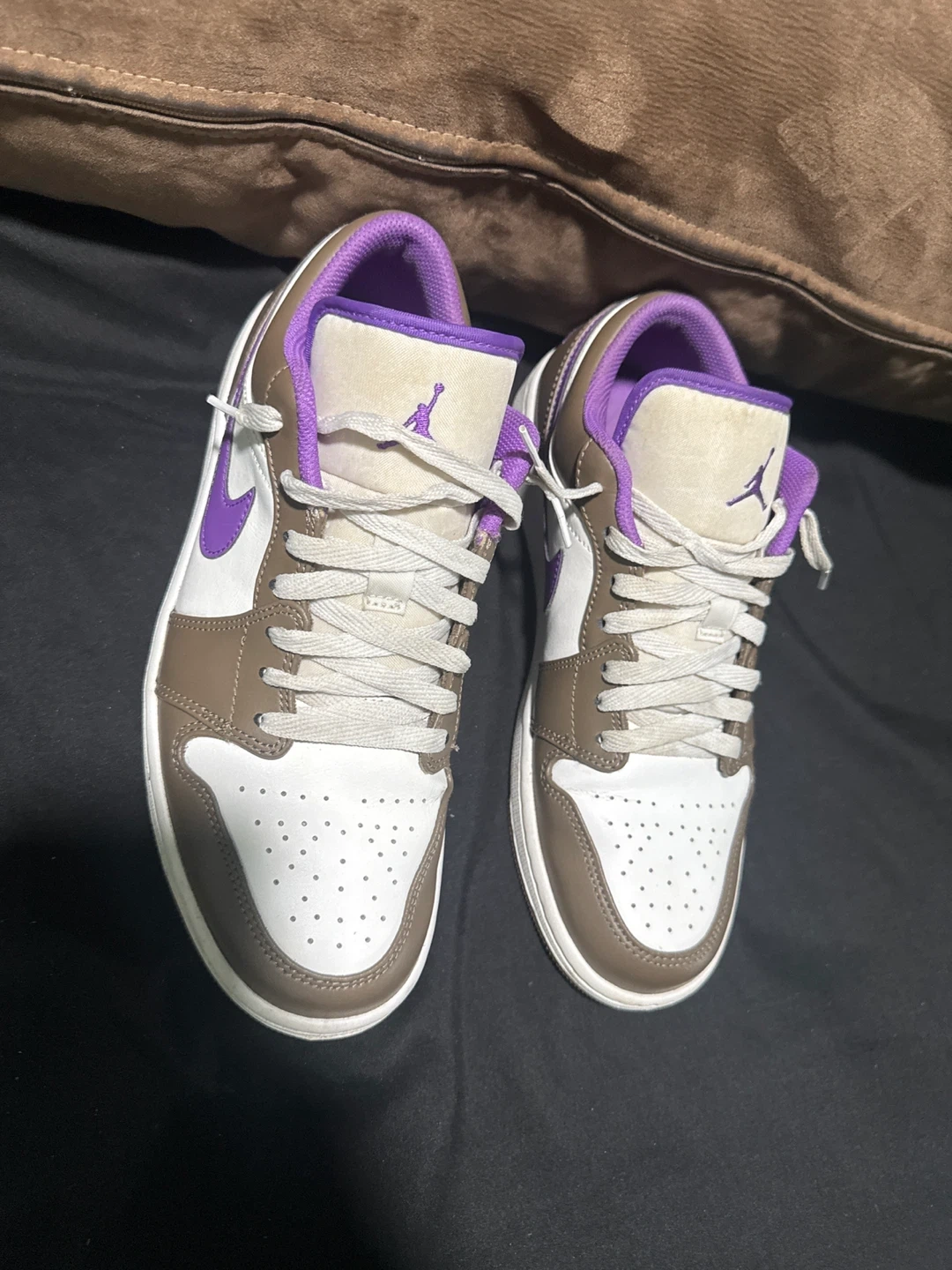 Selling a used pair of Nike Air Jordan 1 Low sneakers in a stylish white, purple, and brown colorway. They come with the original box. Check out the photos for details! Used but still a lot of life left to be in a new home. Price negotiable but not too much. Meet at shopping malls and secure places for your and my safety. I have different shoes if you want. No phone calls Text me only if interested:9297693201