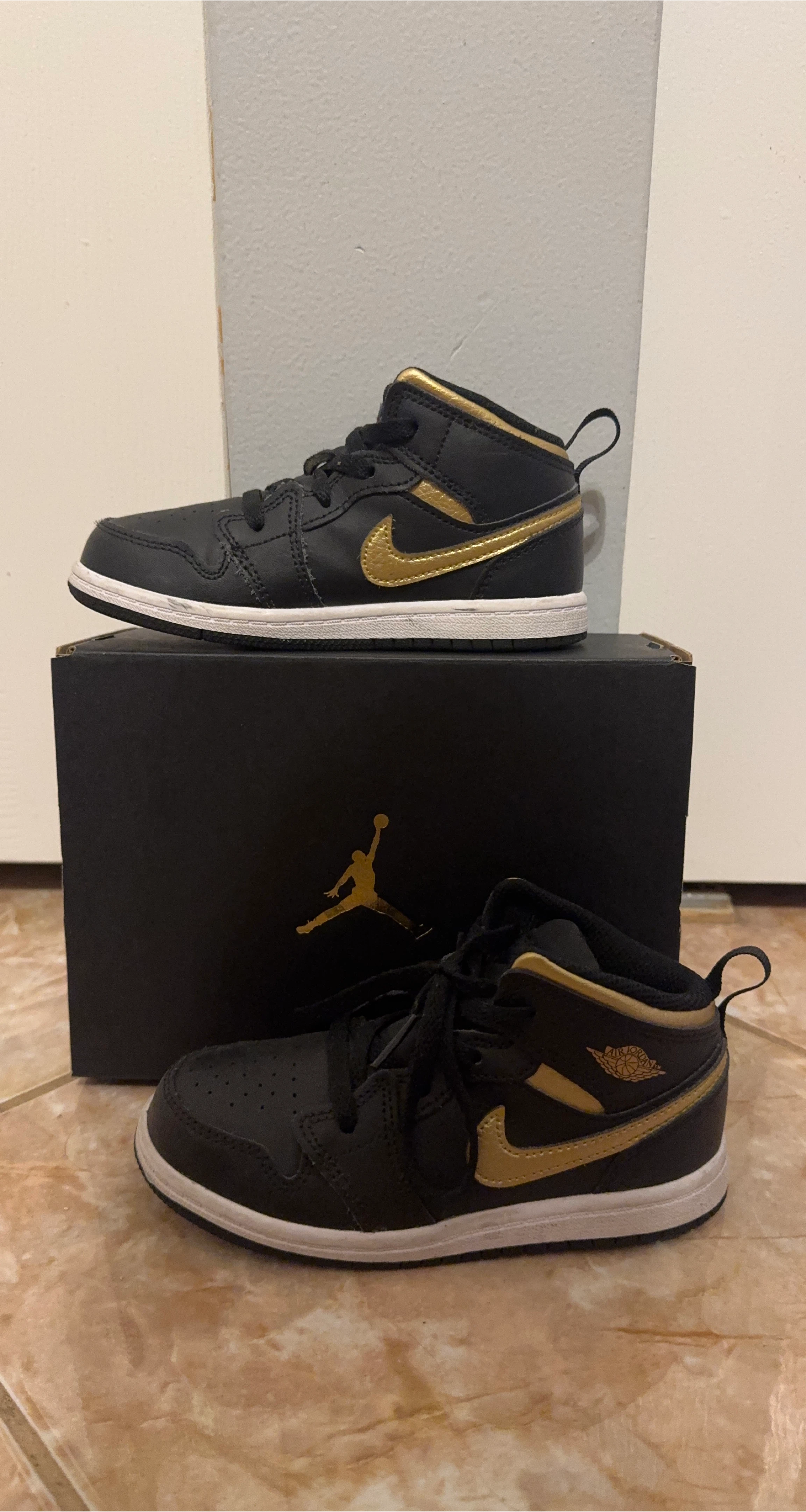 Selling a pair of toddler-sized Jordan 1 Mid shoes in black and gold. They come with the original box! Perfect for your little one.