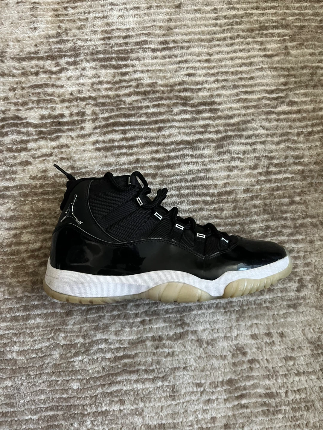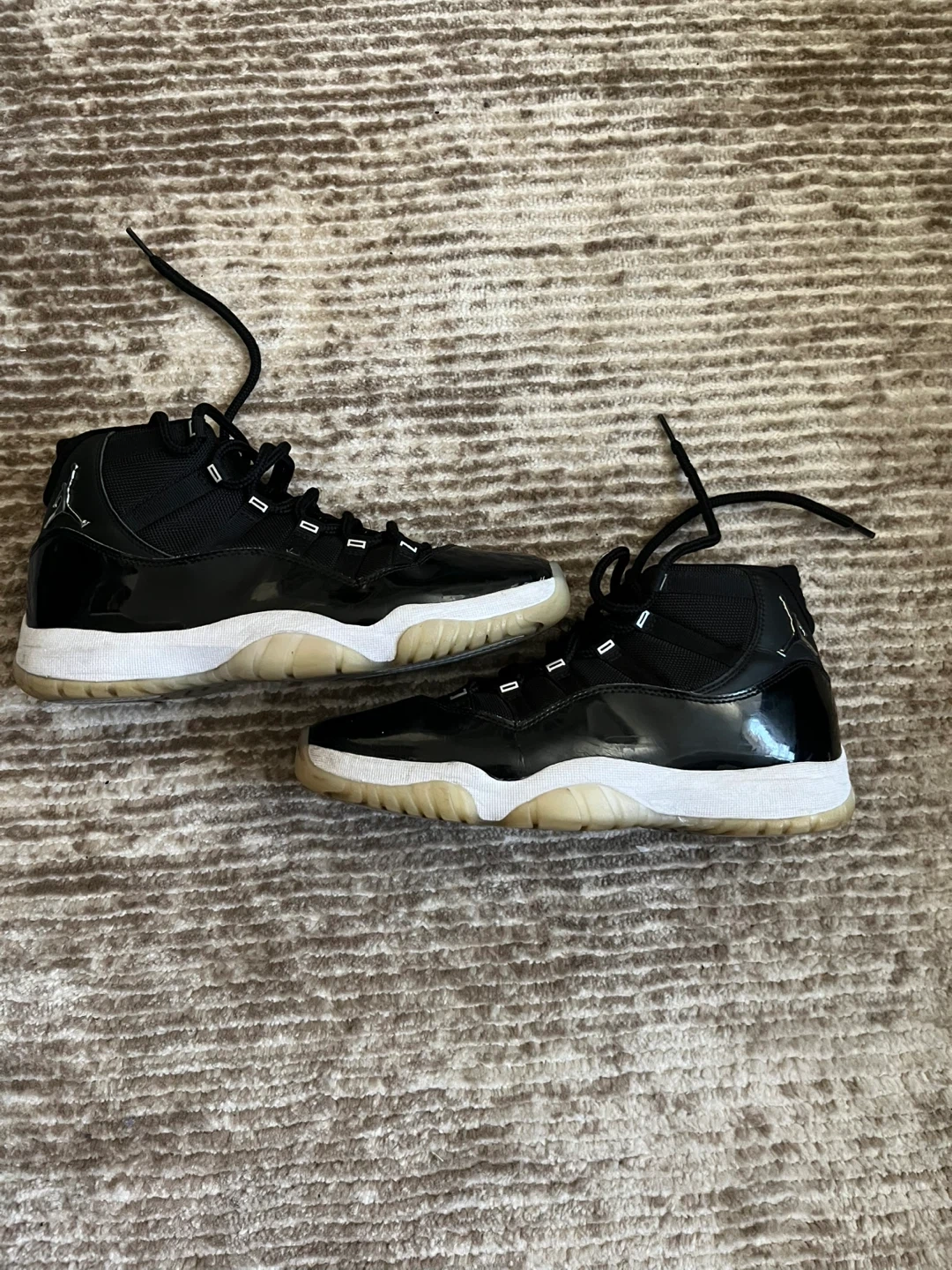 65Selling a pair of Jordan 11 Retro jubilee sneakers. They are black and white. Please see photos for condition